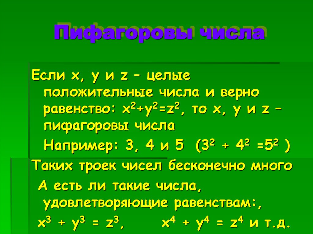 равенство: x2+y2=z2, то x, y и z –