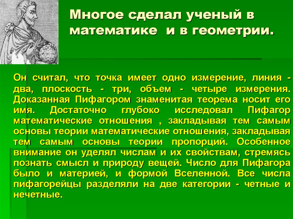 Он считал, что точка имеет одно измерение, линия два, плоскость - три, объем - четыре измерения.Доказанная Пифагором знаменитая теорема носит его