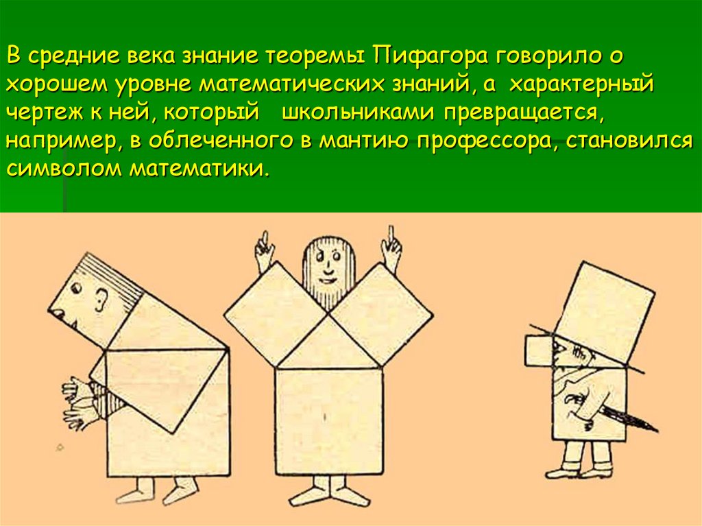 10. В средние века знание теоремы Пифагора говорило о хорошем уровне математических знаний, а характерный чертеж к ней, который