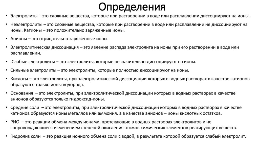 • Электролиты – это сложные вещества, которые при растворении в воде или расплавлении диссоциируют на ионы.• Неэлектролиты – это сложные вещества, которые при растворении в воде или расплавлении не диссоциируют на