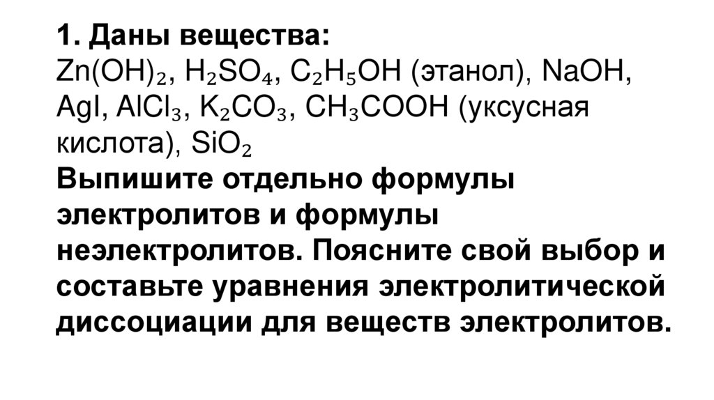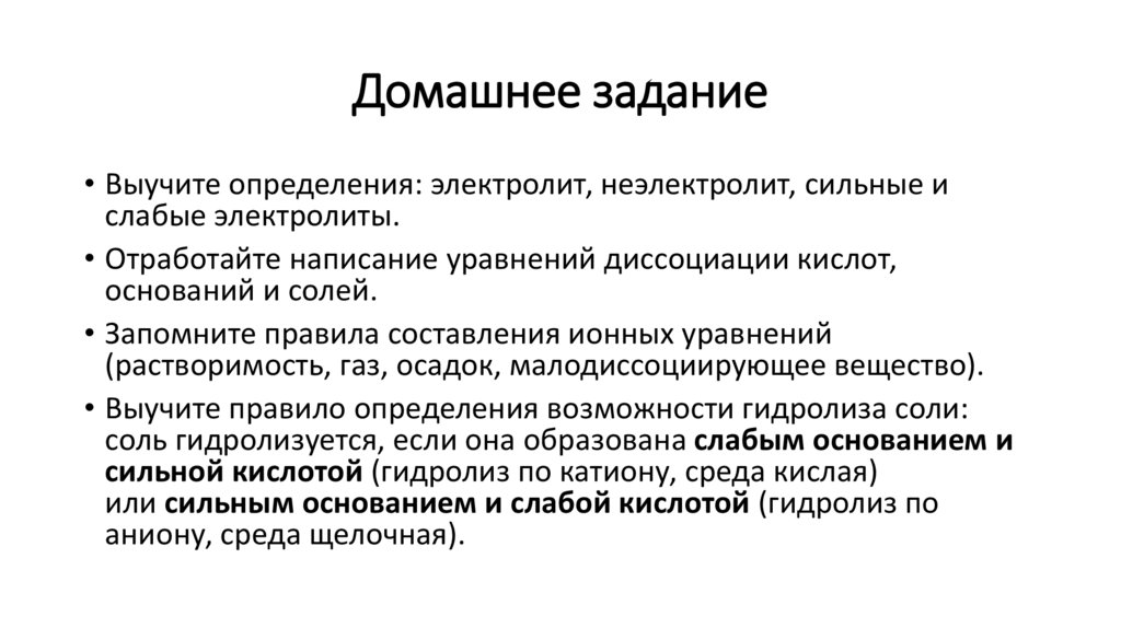 • Выучите определения: электролит, неэлектролит, сильные ислабые электролиты.