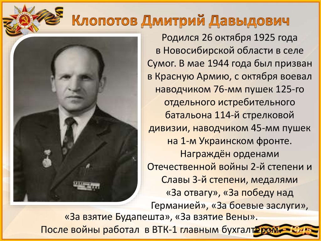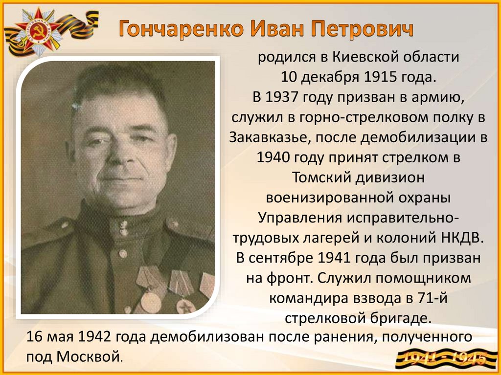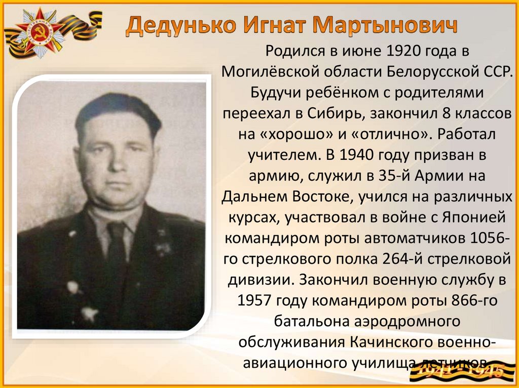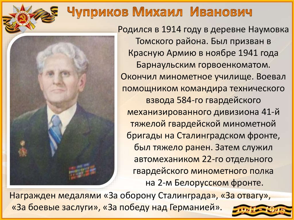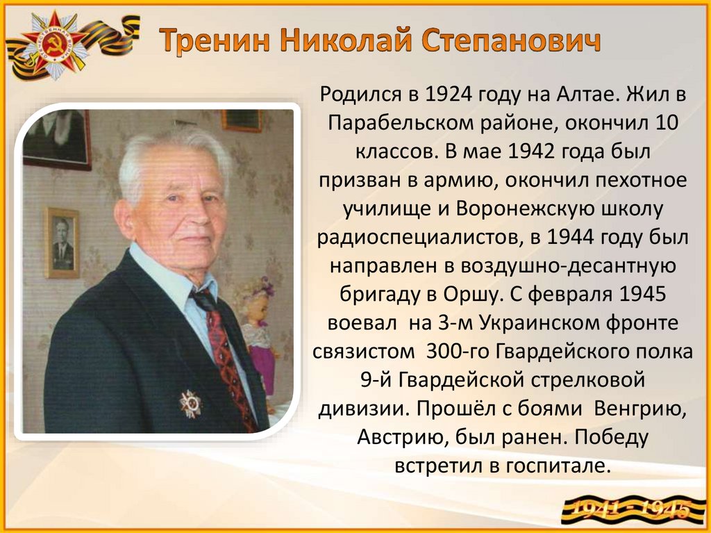 Родился в 1925 году. Призван в армиюв 1943 году в Алтайском крае. После