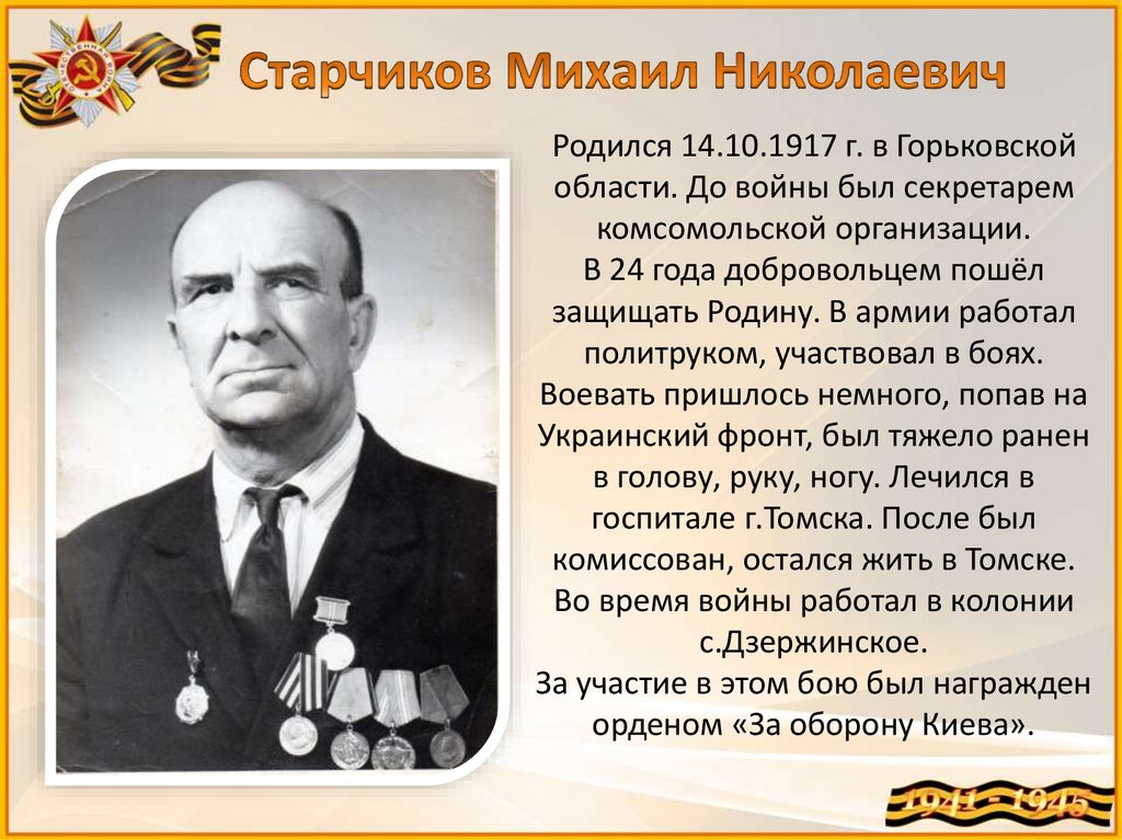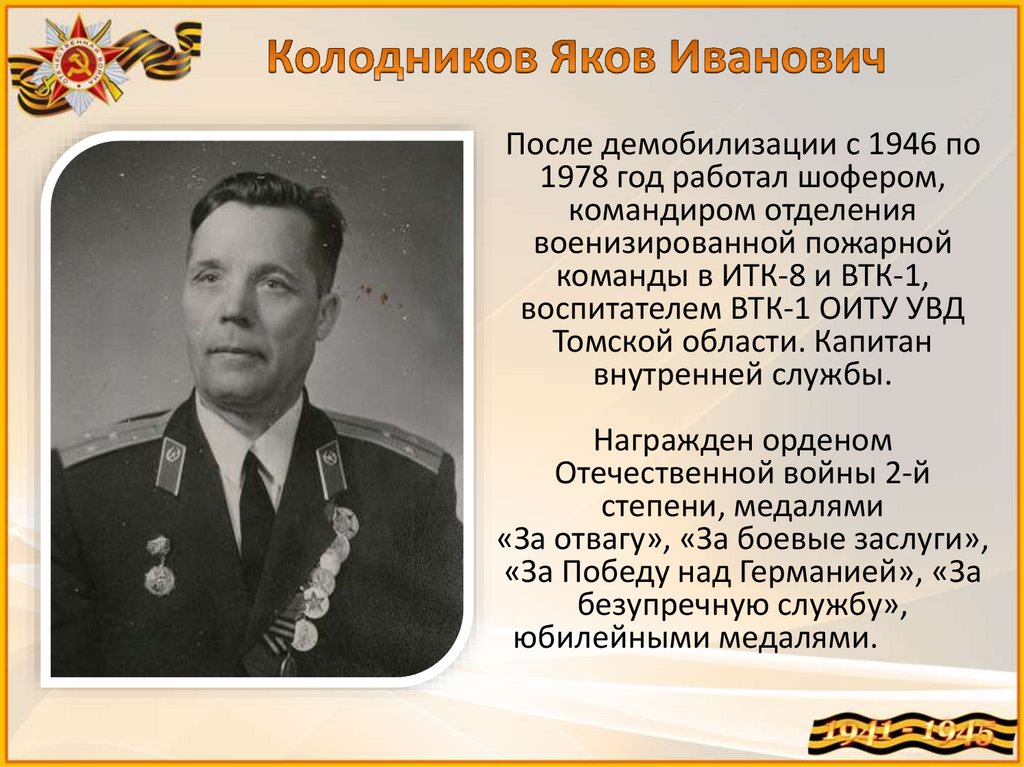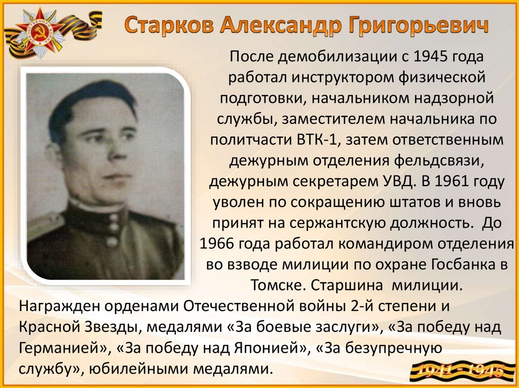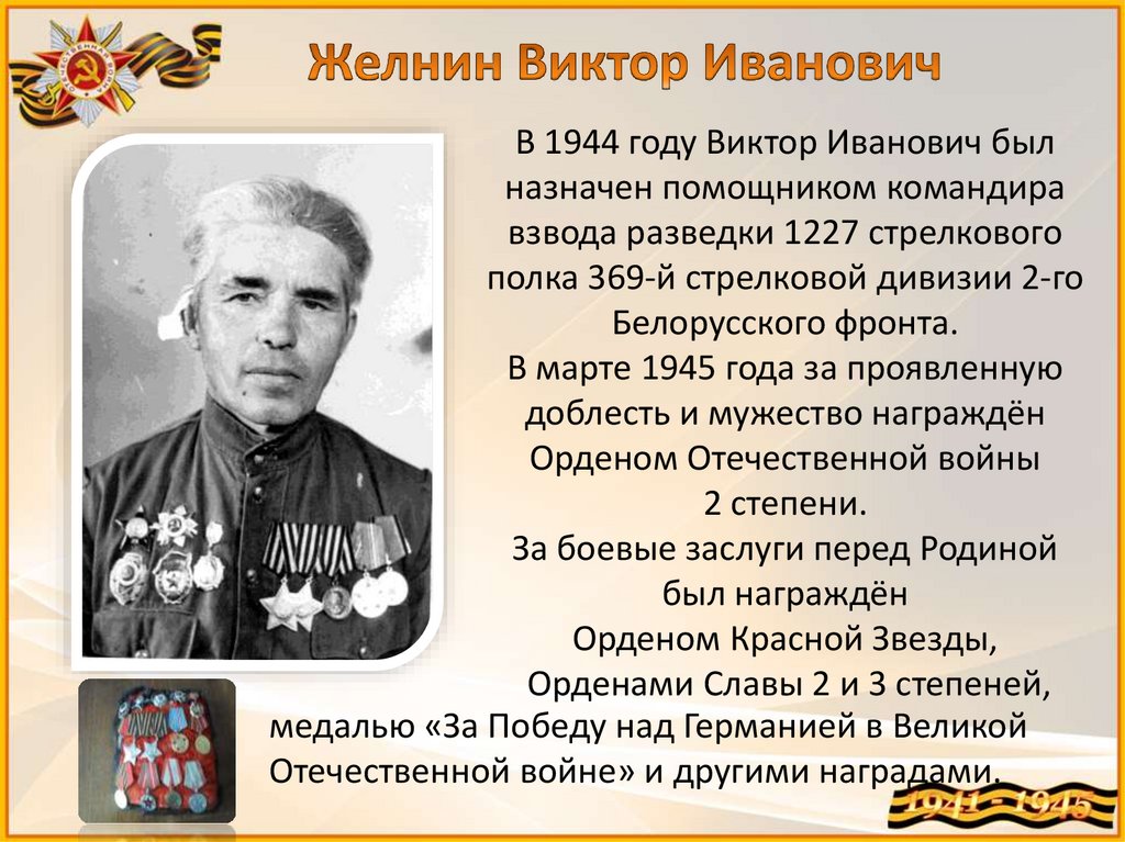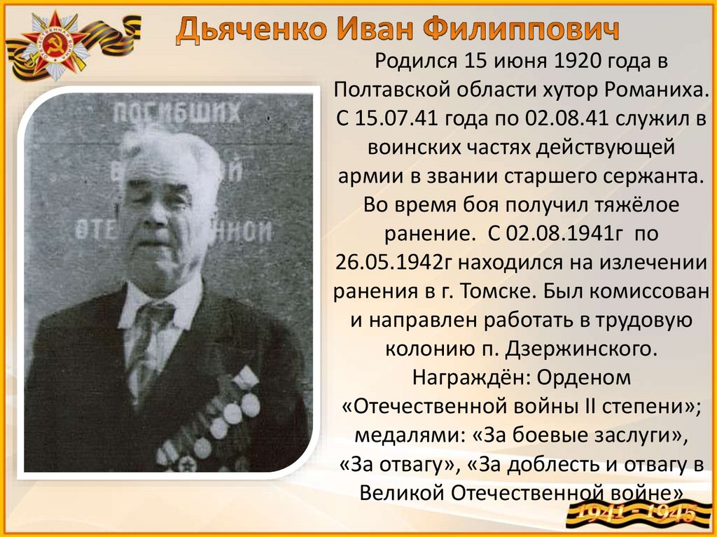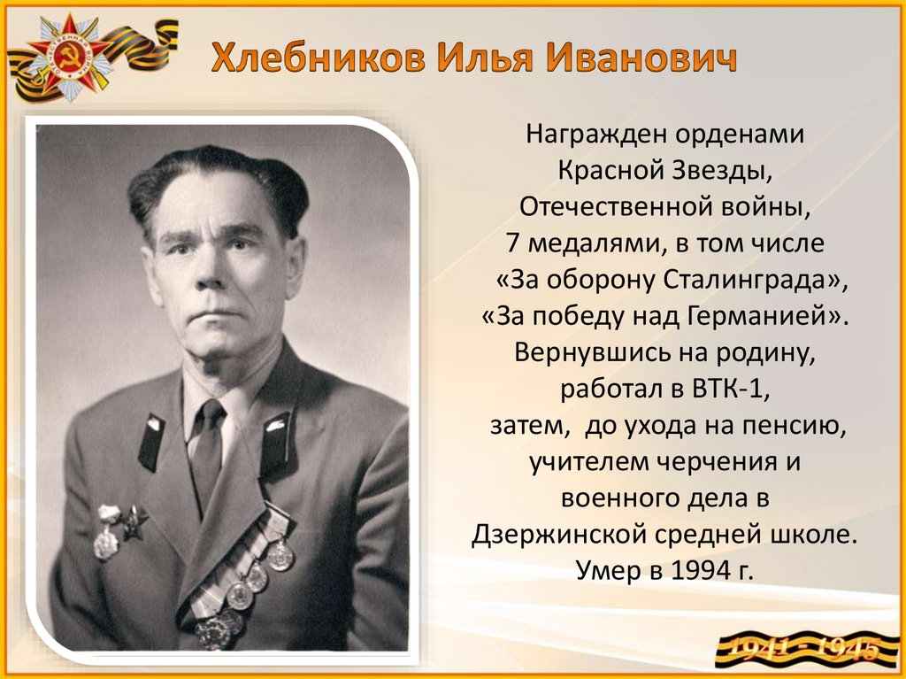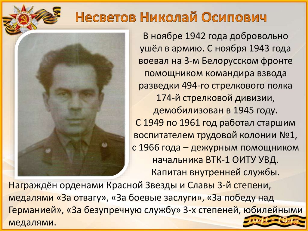 удостоен наград за боевые подвиги –ордена Красной Звезды, Отечественной
