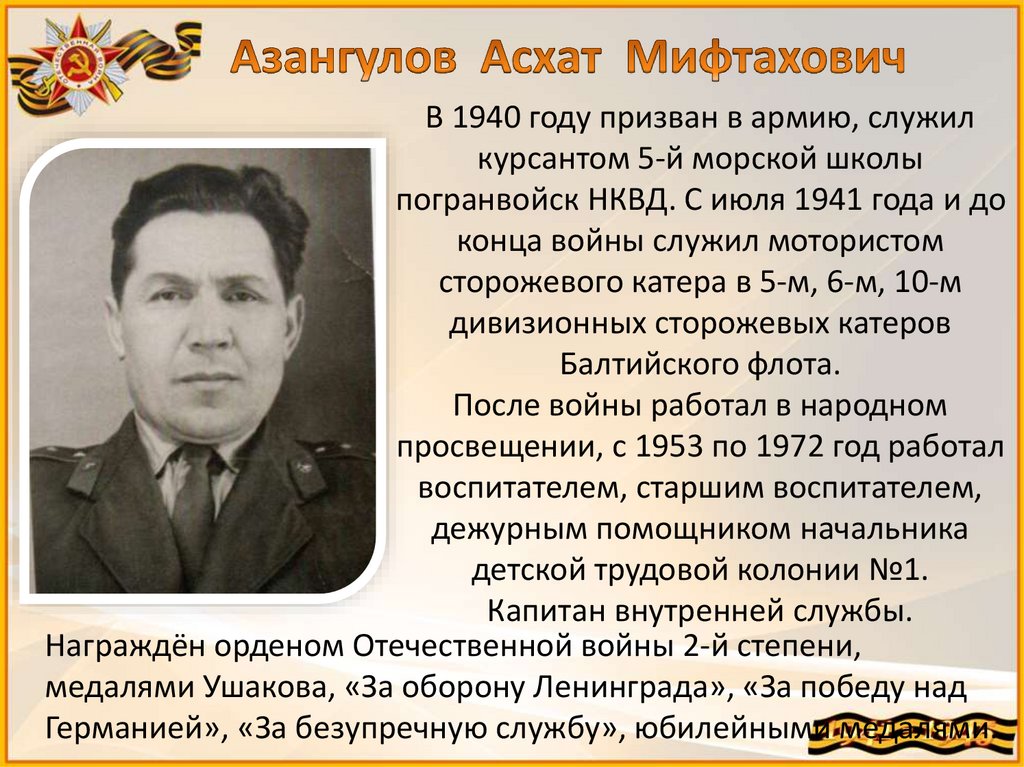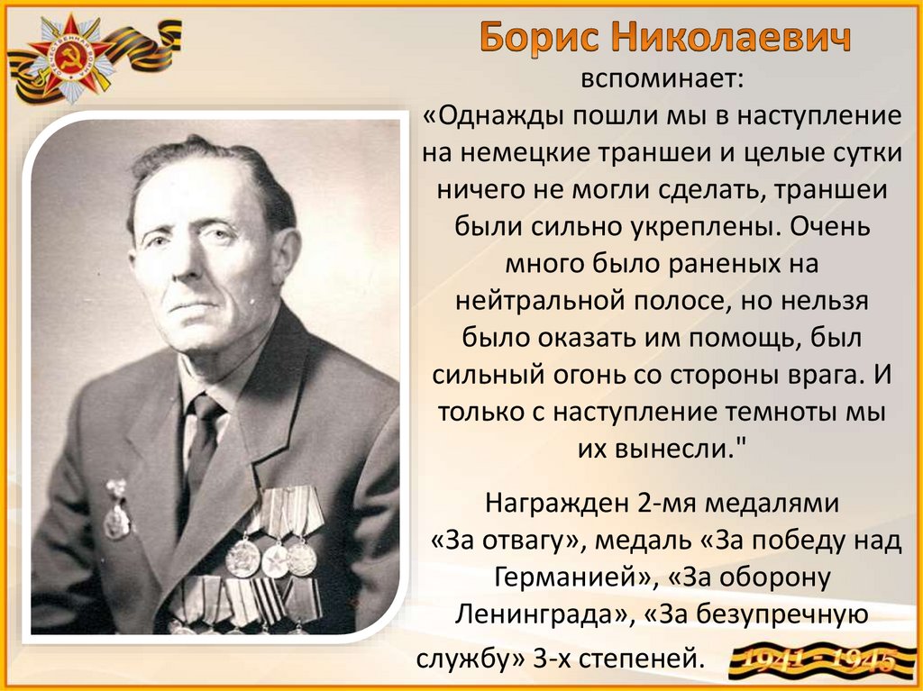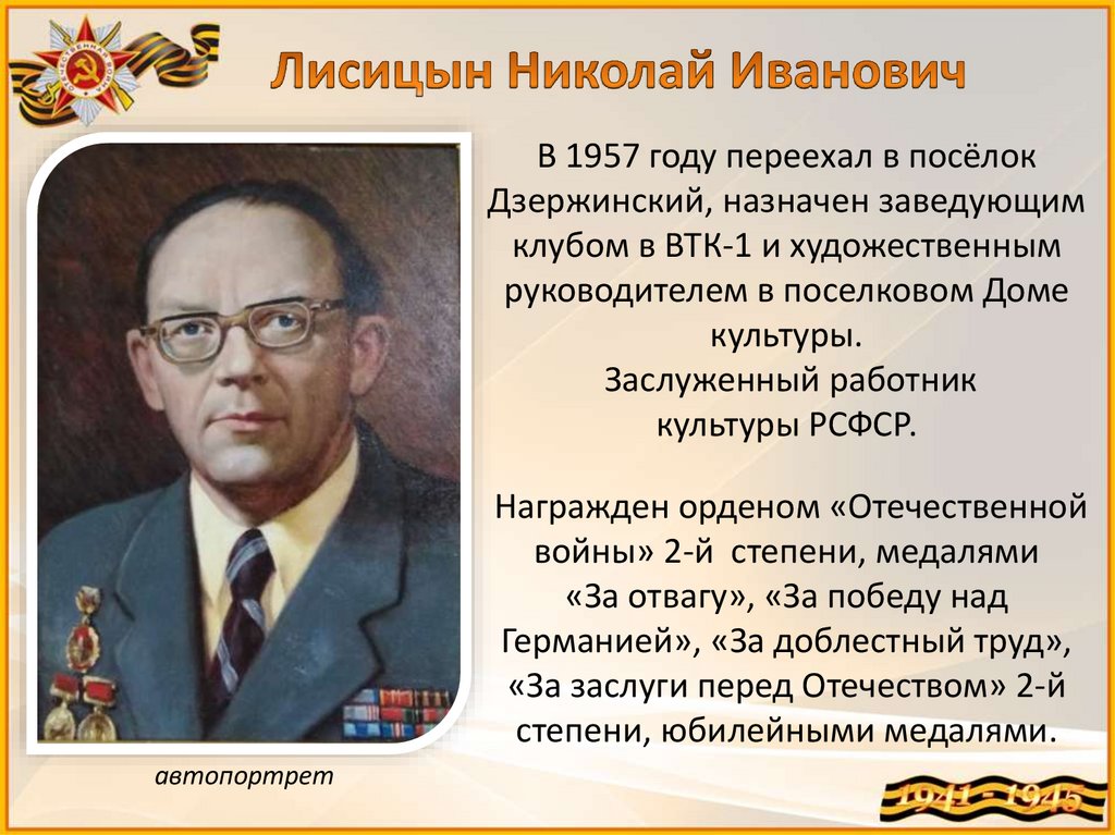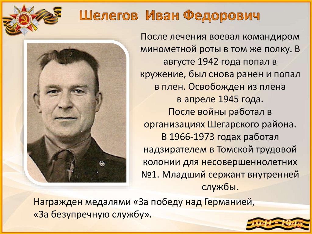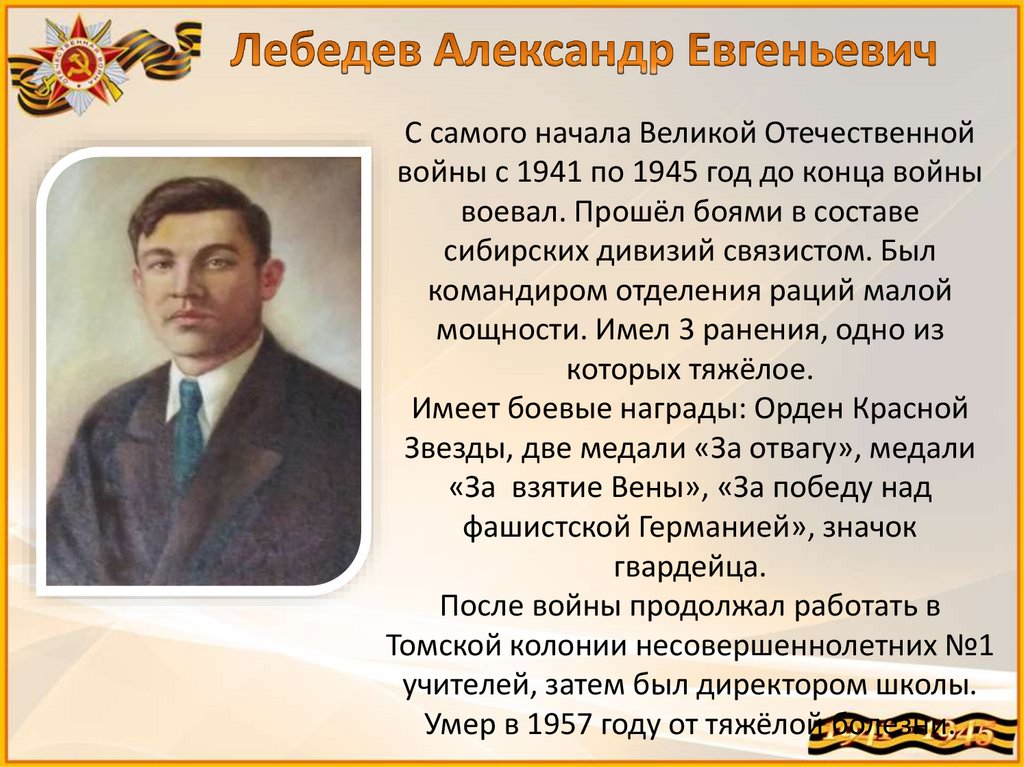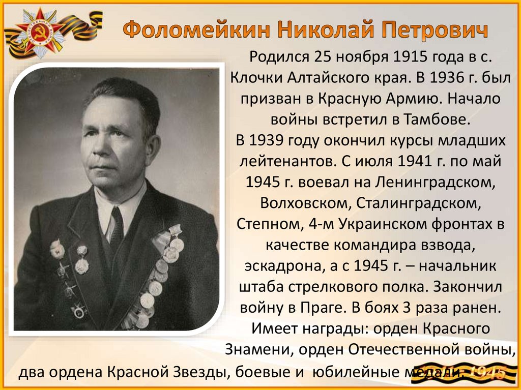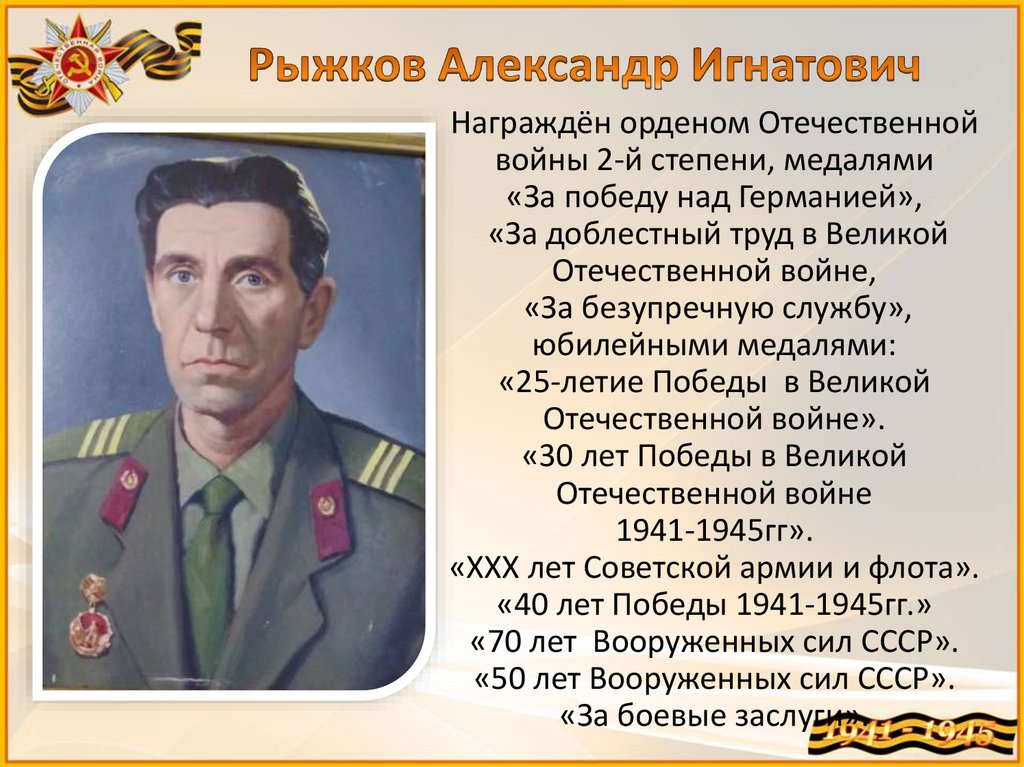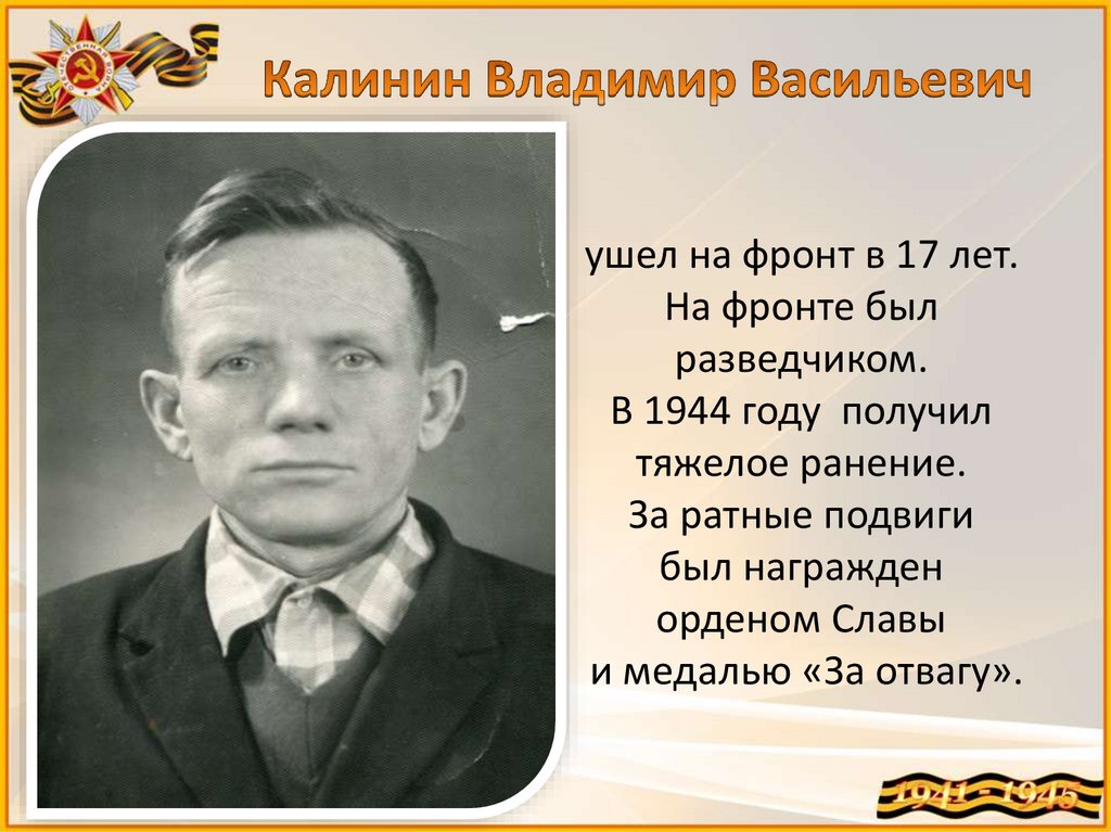 удостоен наград за боевые подвиги –ордена Красной Звезды, Отечественной