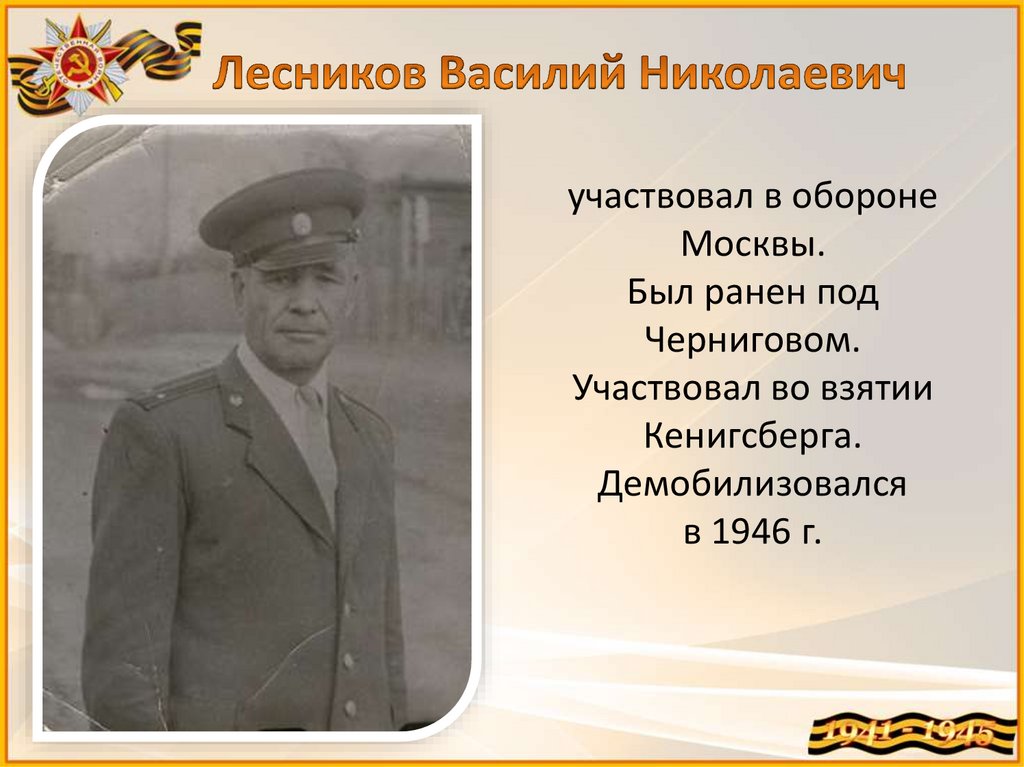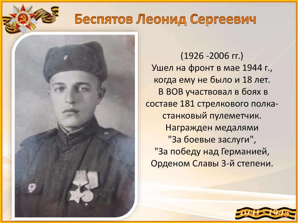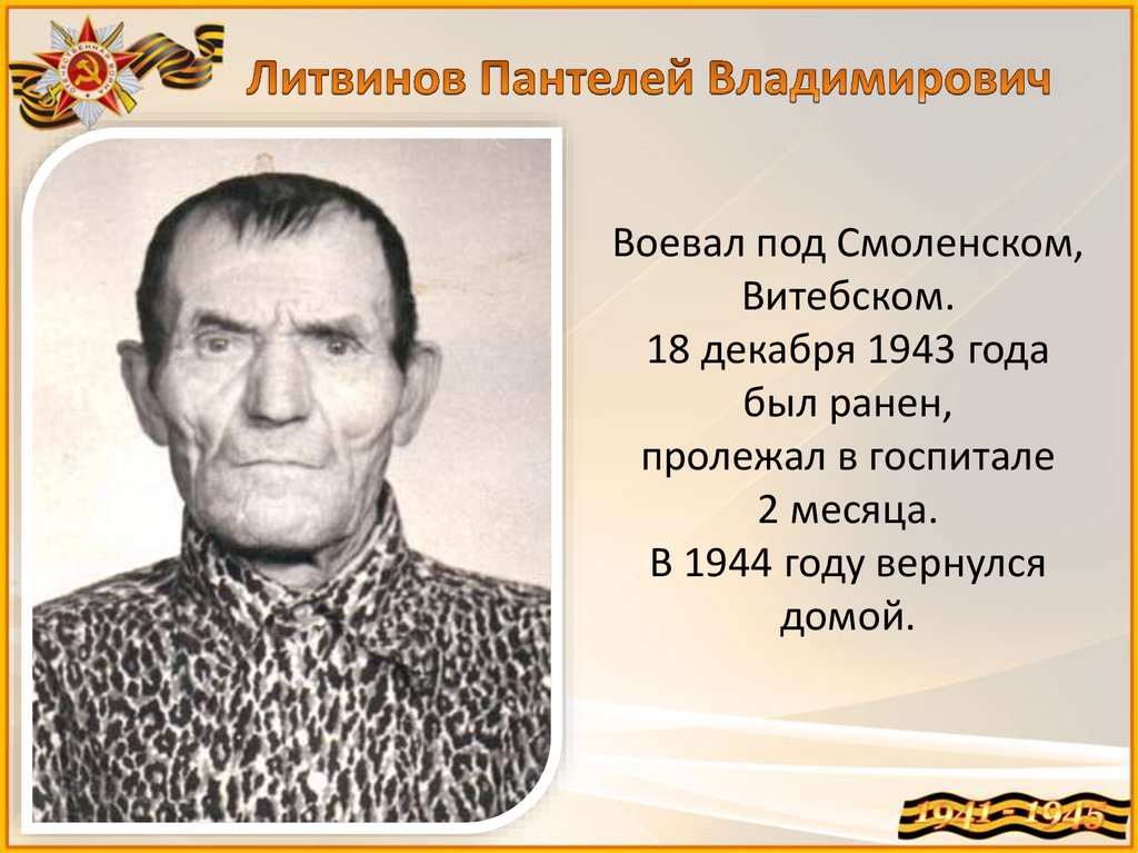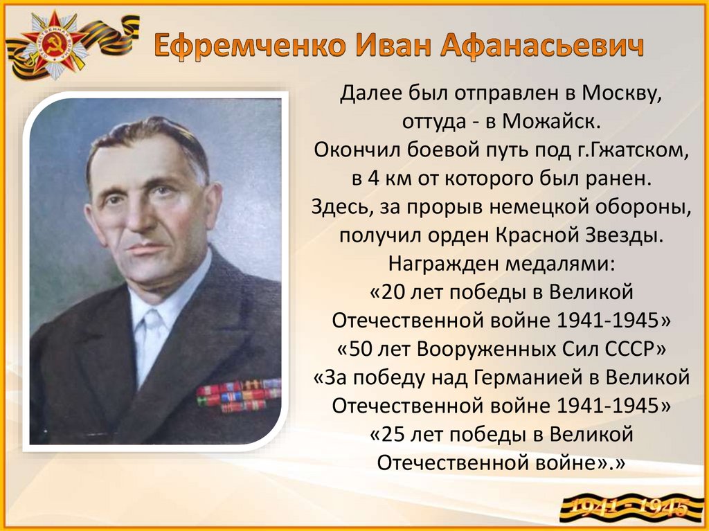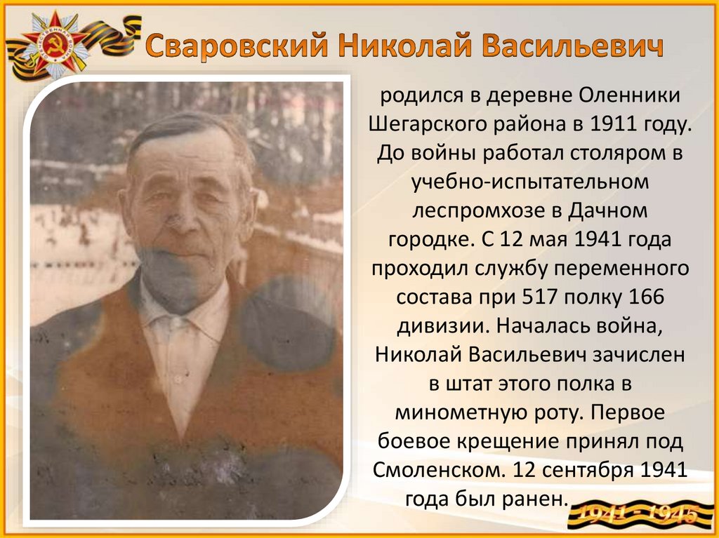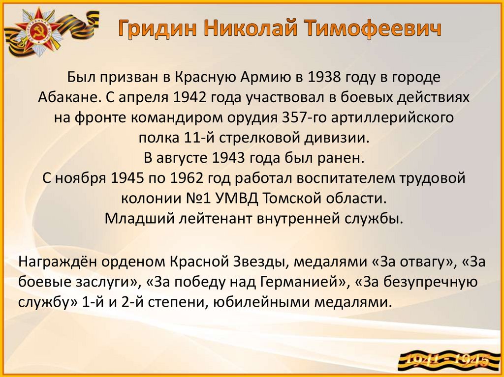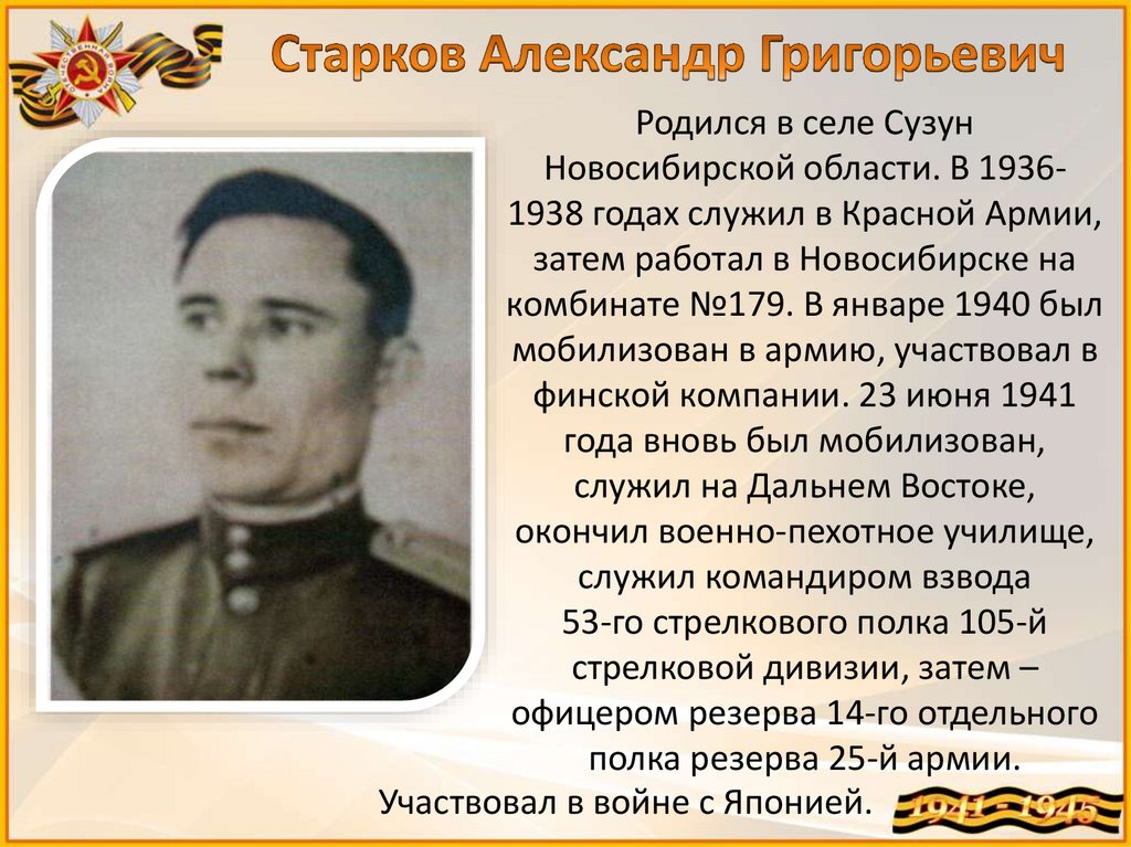 удостоен наград за боевые подвиги –ордена Красной Звезды, Отечественной