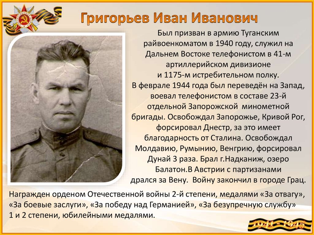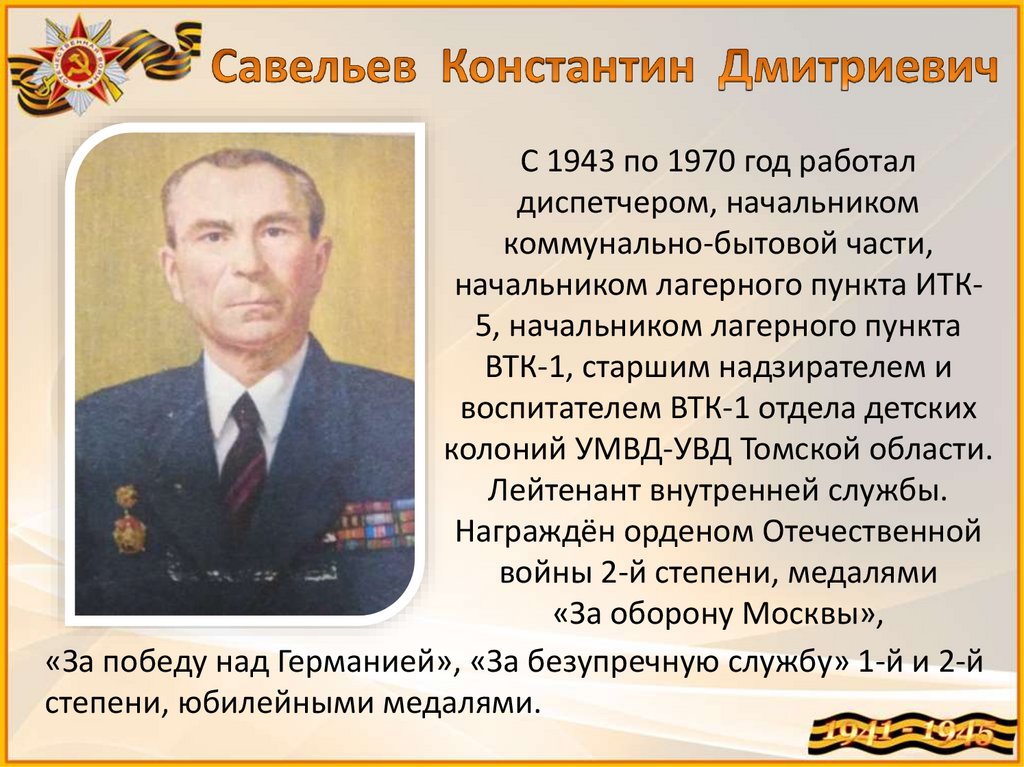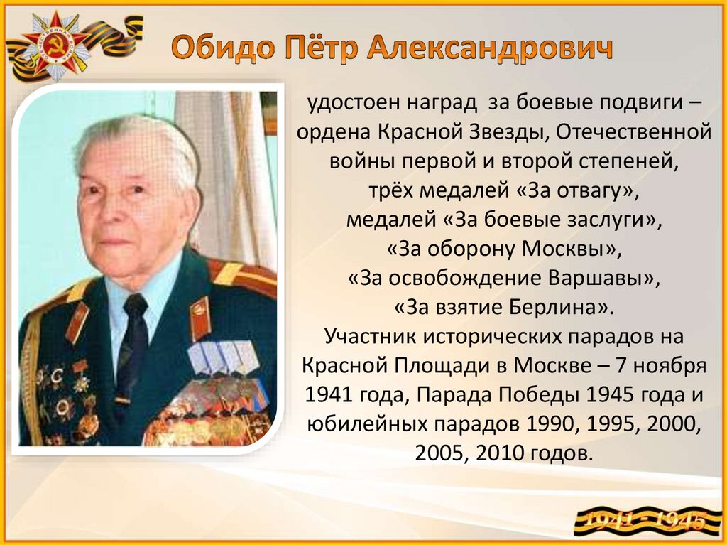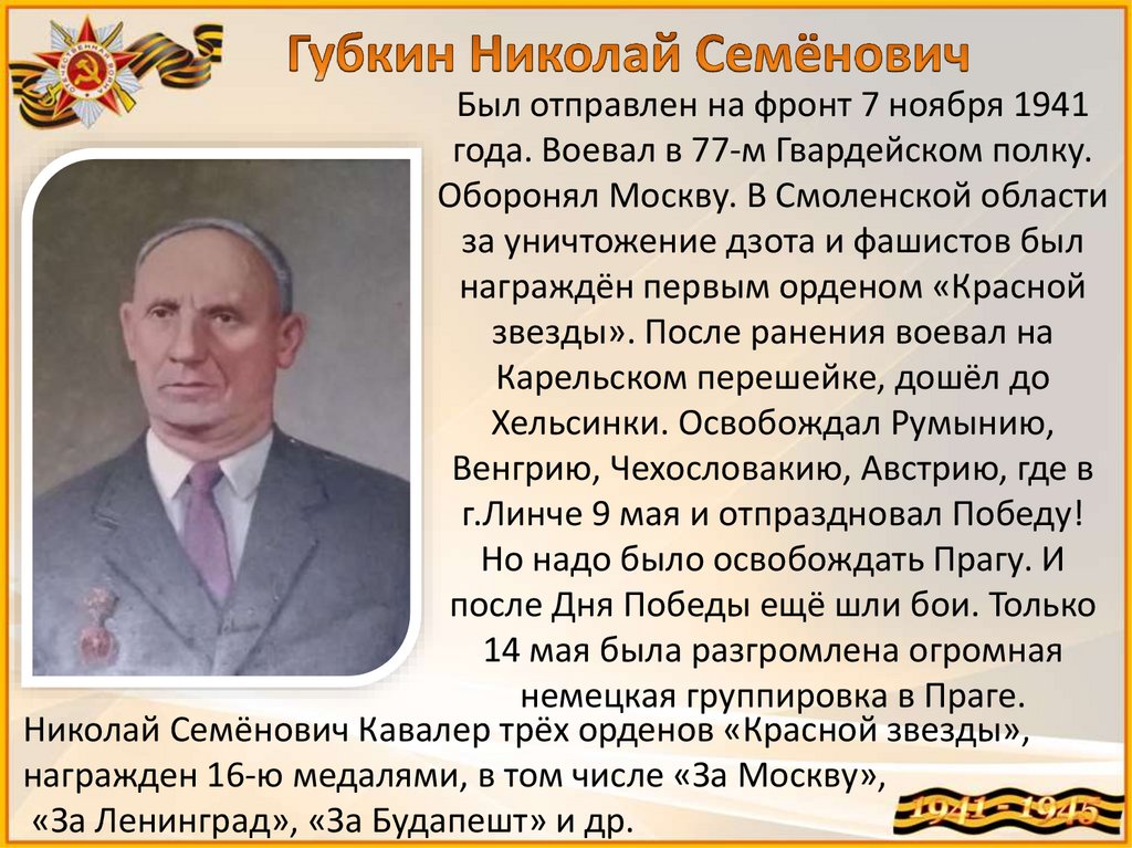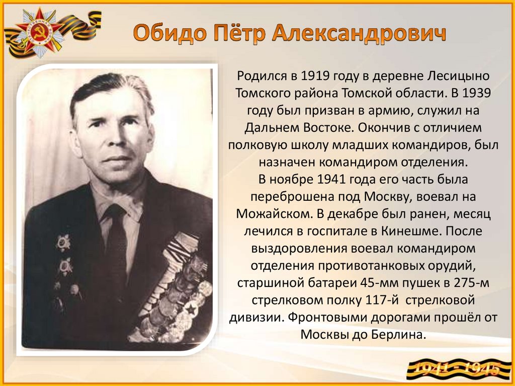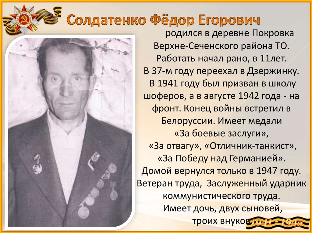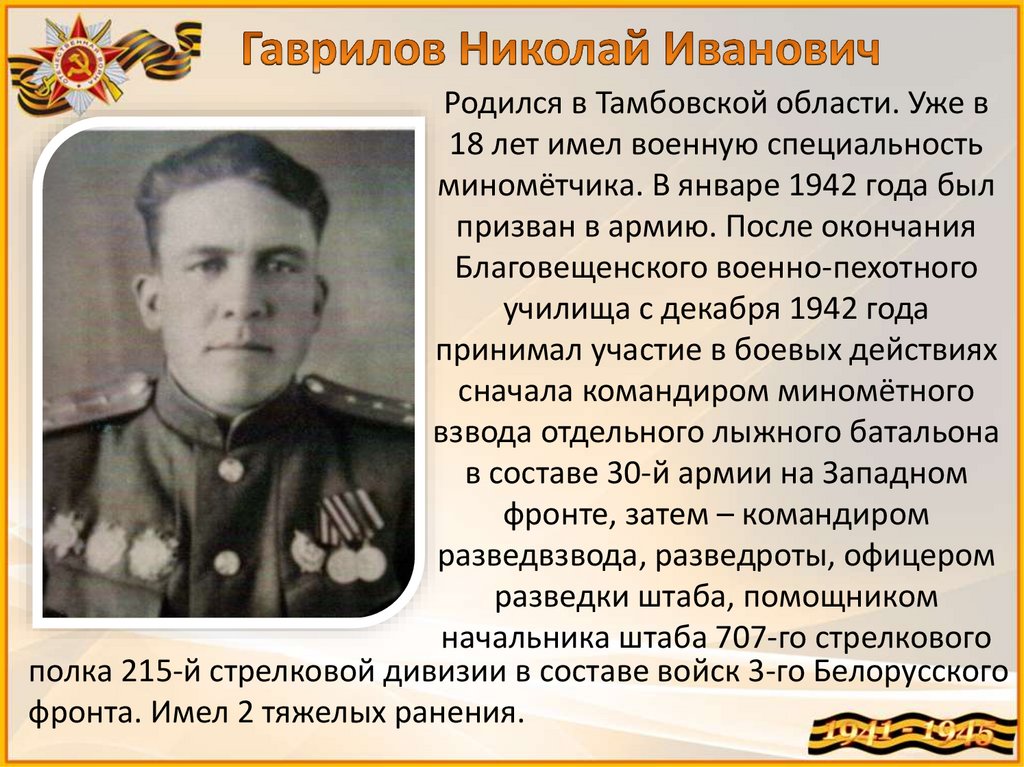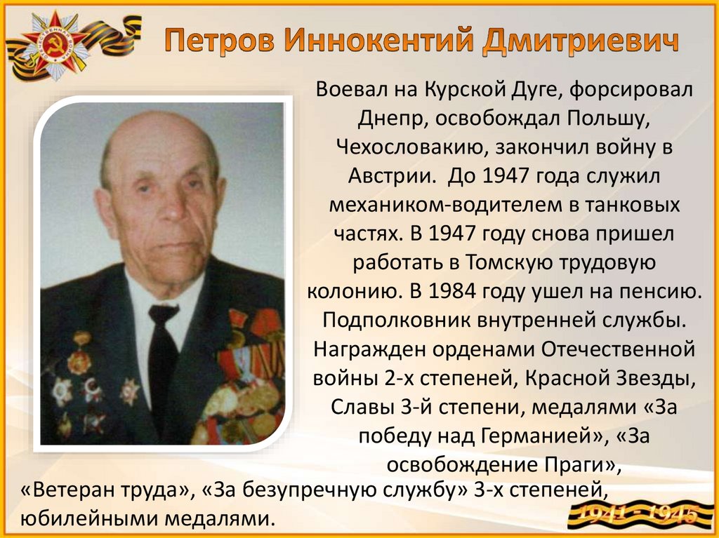 удостоен наград за боевые подвиги –ордена Красной Звезды, Отечественной