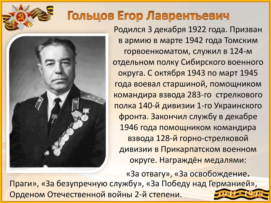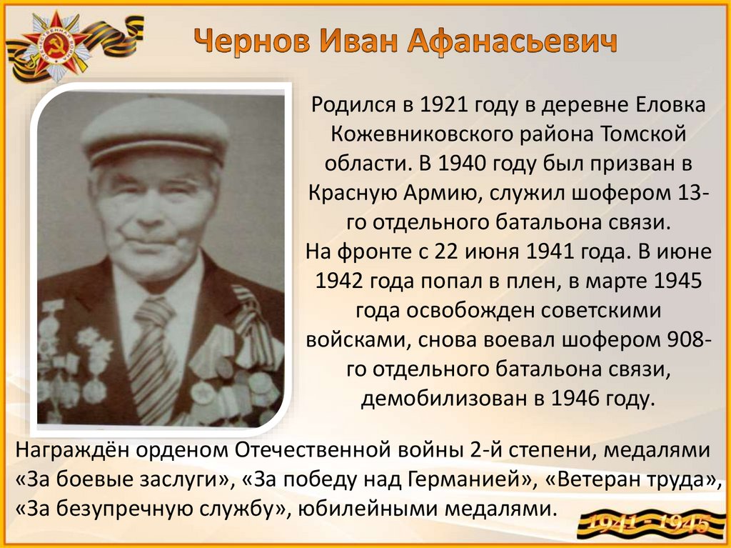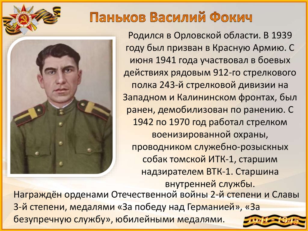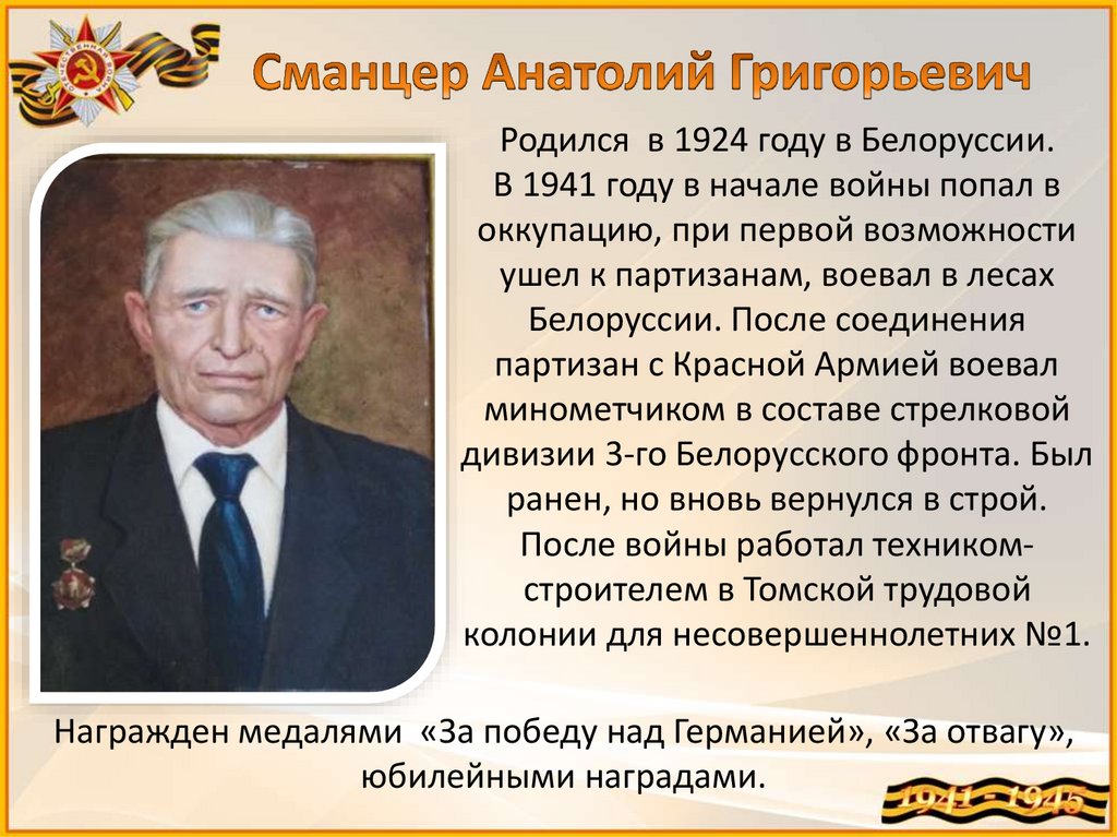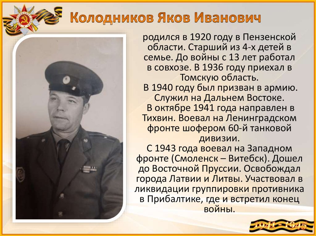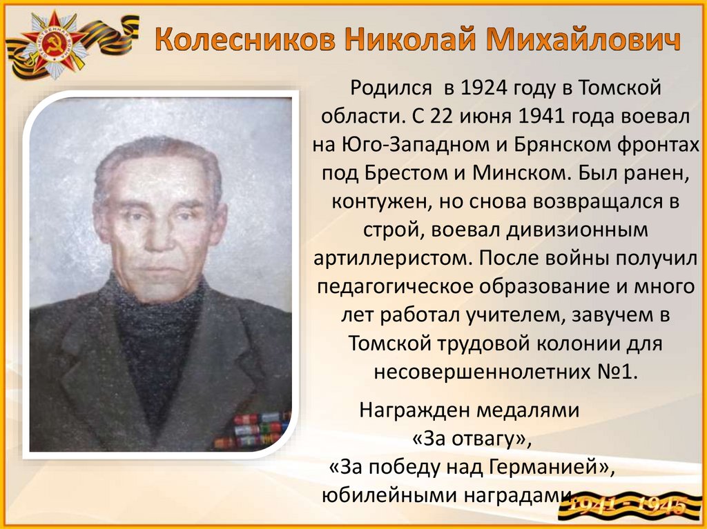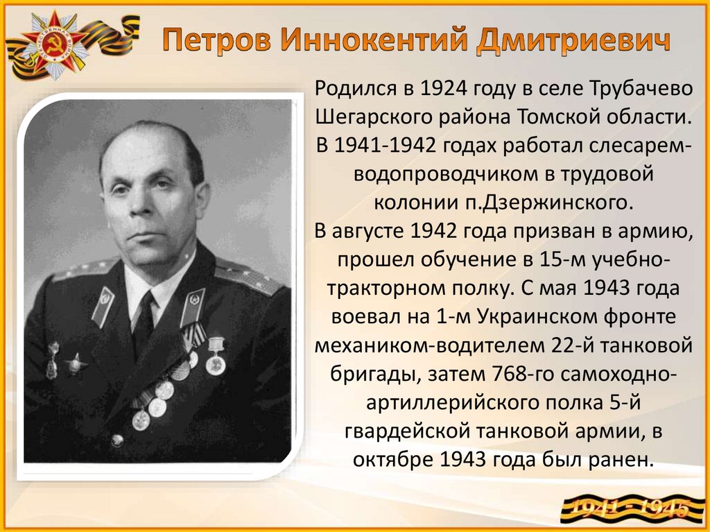 Родился в 1924 году в Томскойобласти. С 22 июня 1941 года воевал