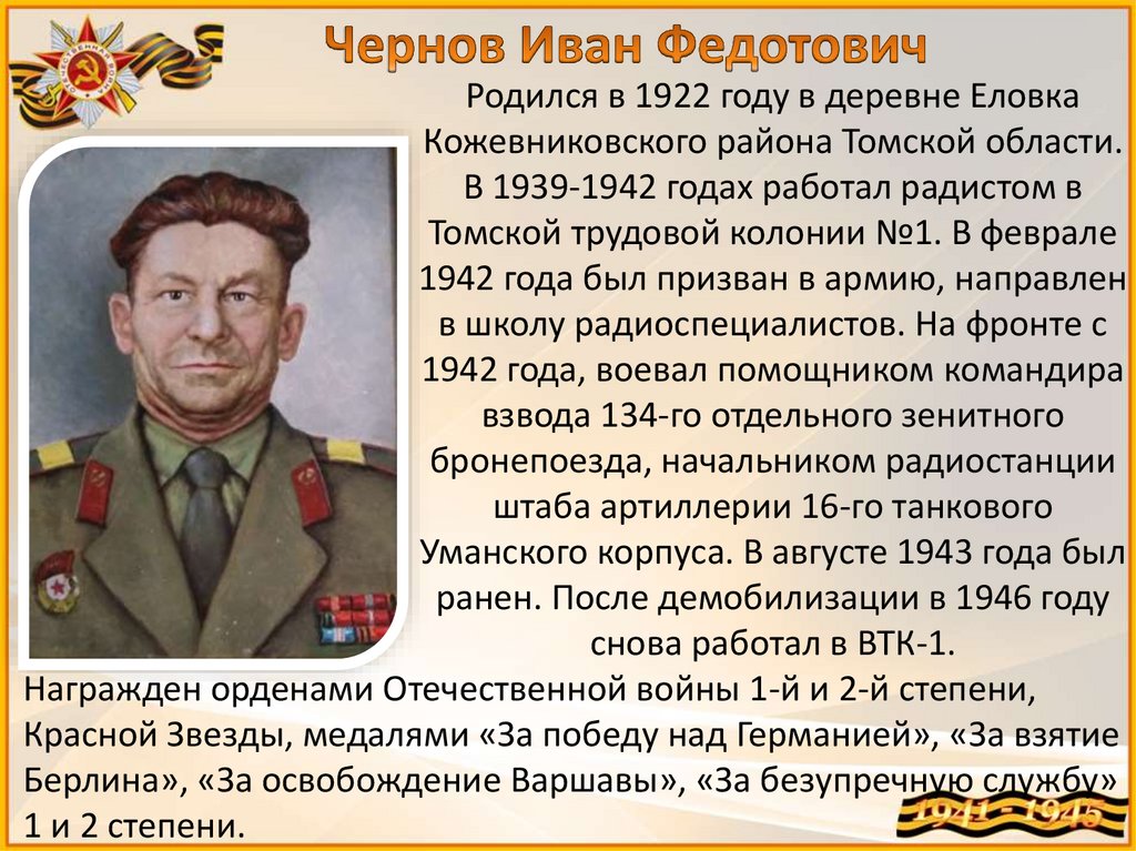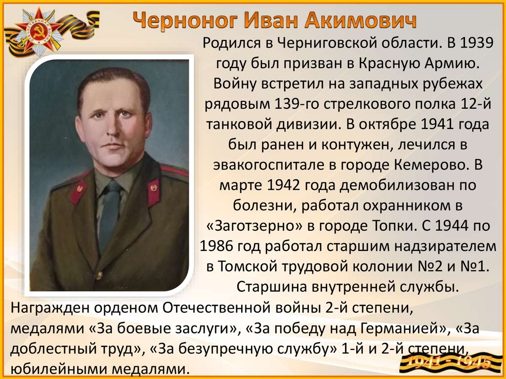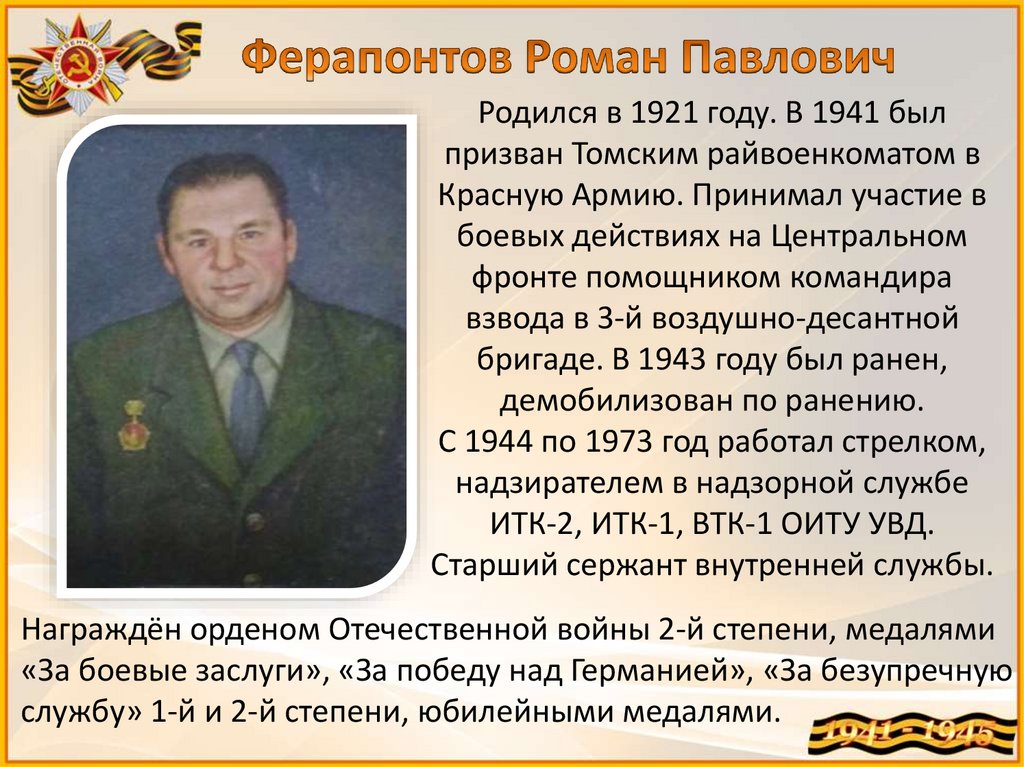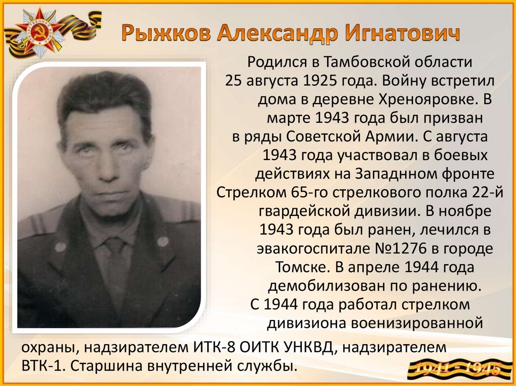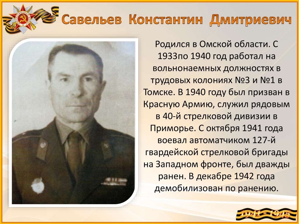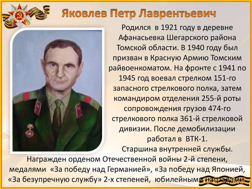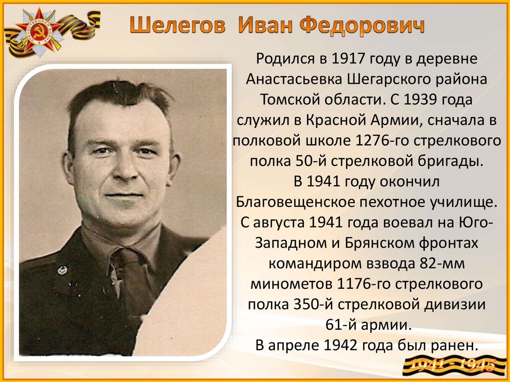 Родился в 1924 году в Томскойобласти. С 22 июня 1941 года воевал