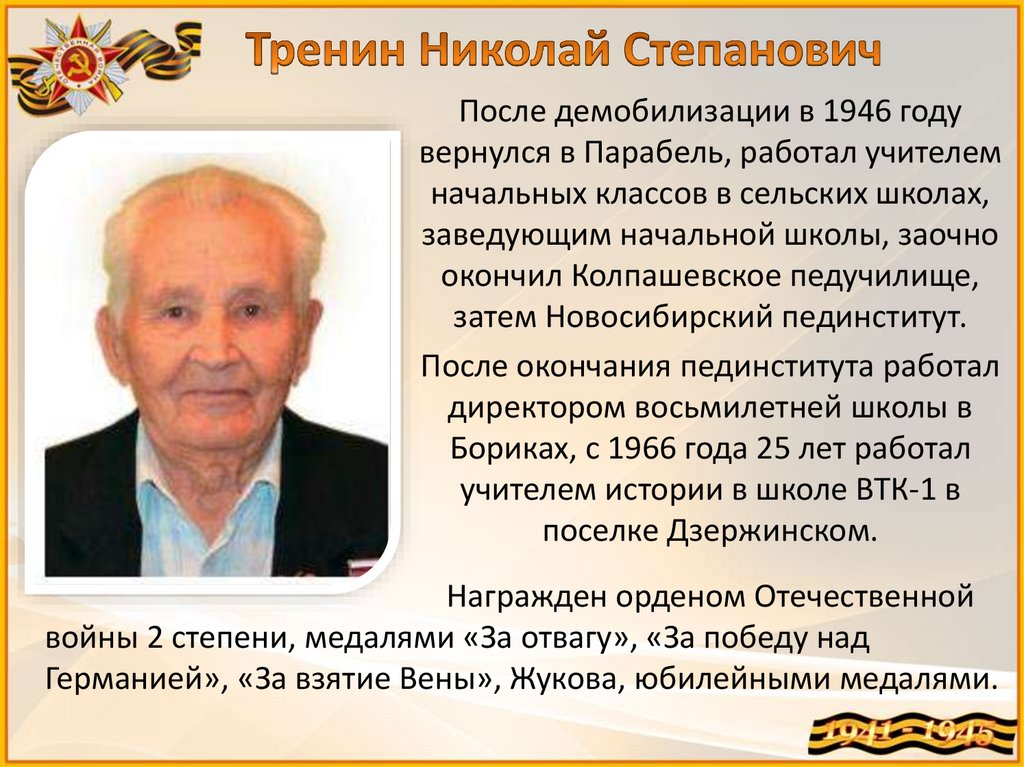 После демобилизации в 1946 годувернулся в Парабель, работал учителем