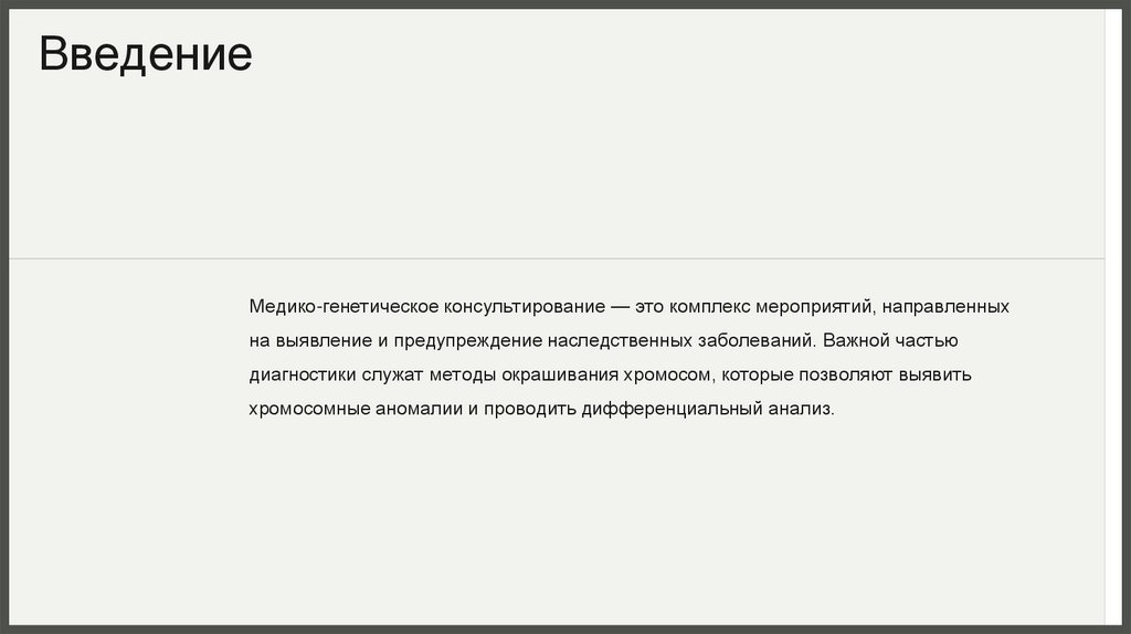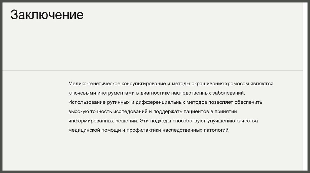 ЗаключениеМедико-генетическое консультирование и методы окрашивания хромосом являются