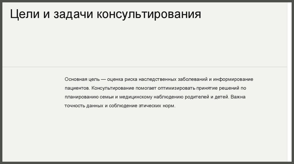 Цели и задачи консультированияОсновная цель — оценка риска наследственных заболеваний и информирование