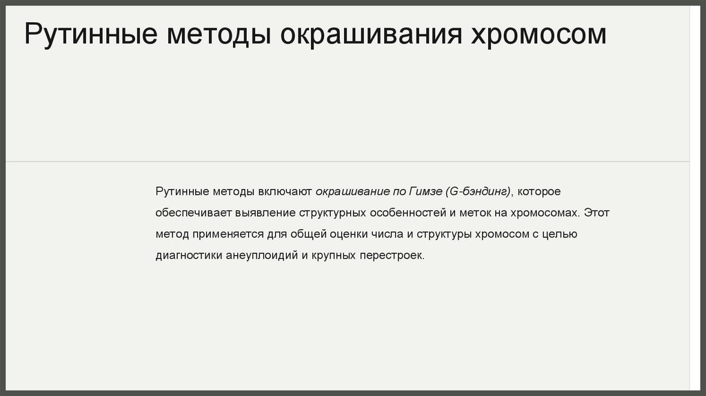 Рутинные методы окрашивания хромосомРутинные методы включают окрашивание по Гимзе (G-бэндинг), которое