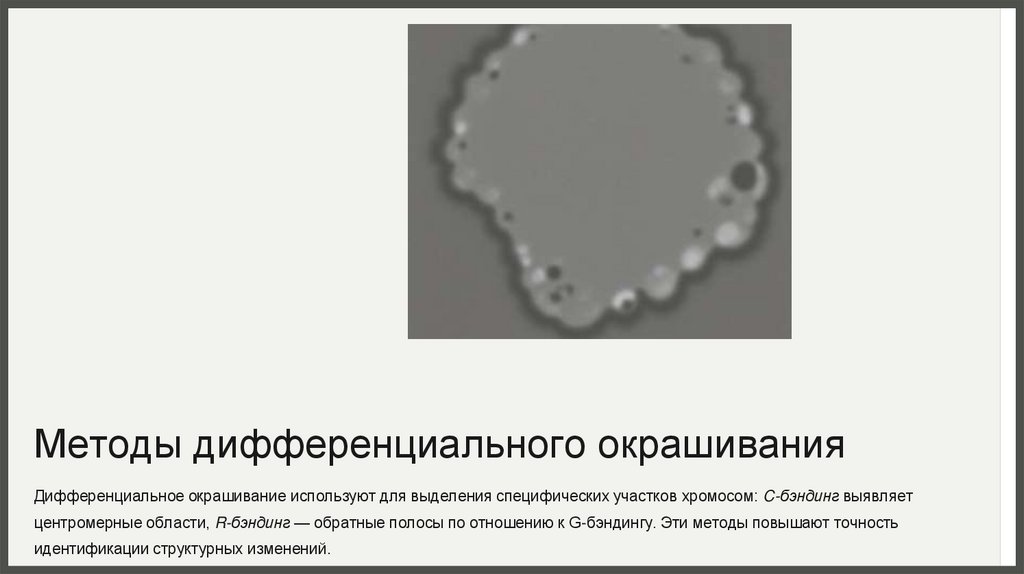 Методы дифференциального окрашиванияДифференциальное окрашивание используют для выделения специфических участков хромосом: C-бэндинг выявляет