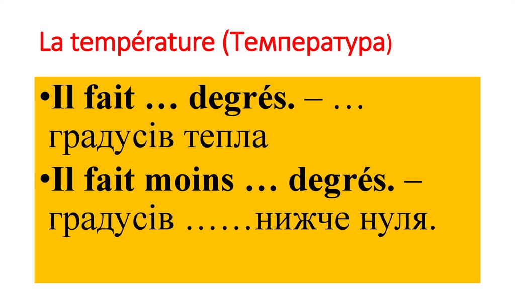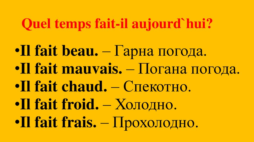 •Il fait beau. – Гарна погода.•Il fait mauvais. – Погана погода.