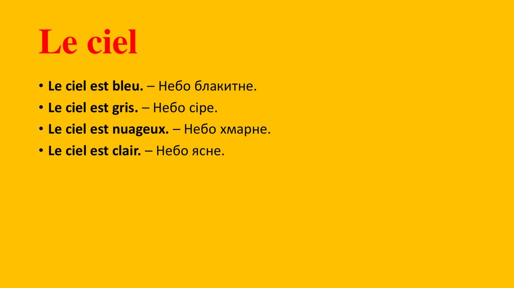 • Le ciel est bleu. – Небо блакитне.• Le ciel est gris. – Небо сіре.