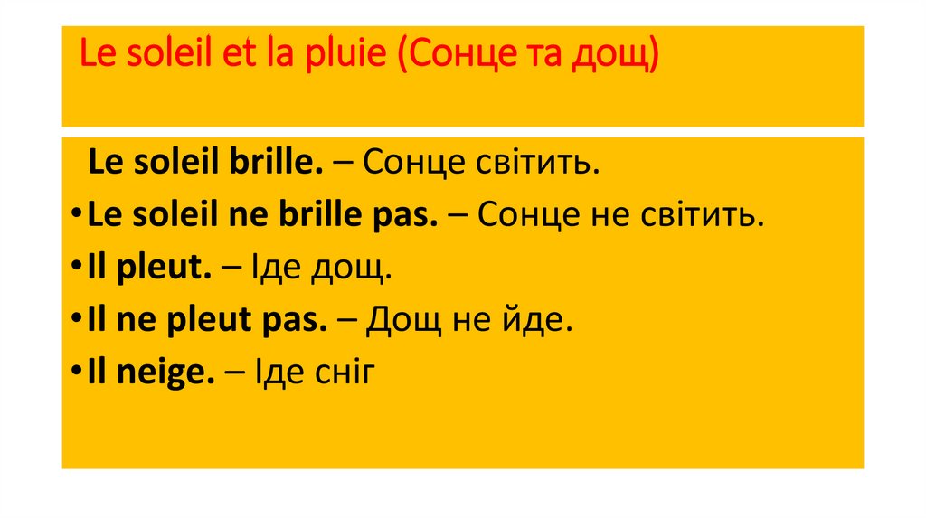 Le soleil brille. – Сонце світить.•Le soleil ne brille pas. – Сонце не світить.