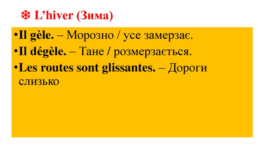 ❄ L’hiver (Зима)•Il gèle. – Морозно / усе замерзає.