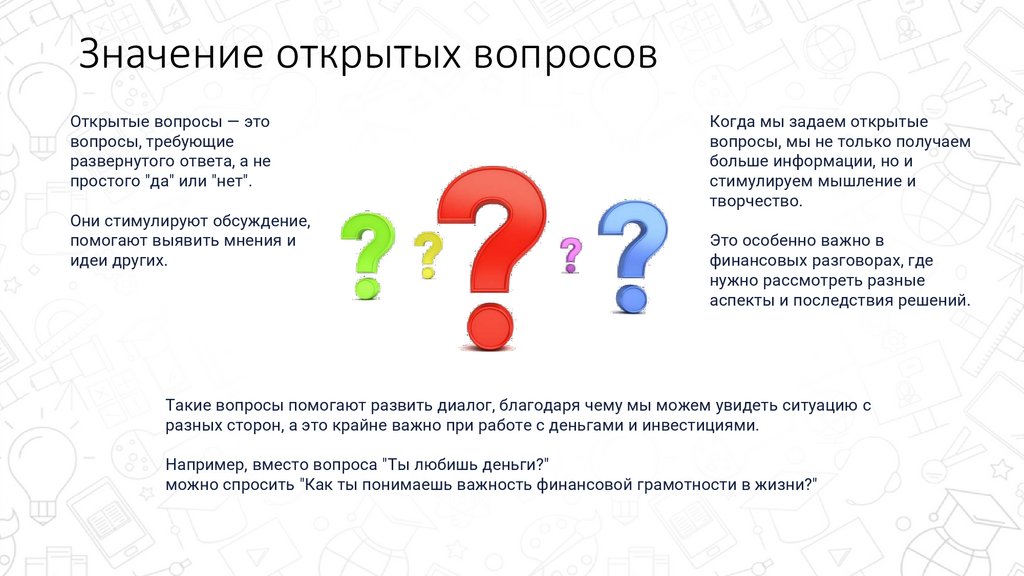 Такие вопросы помогают развить диалог, благодаря чему мы можем увидеть ситуацию с
