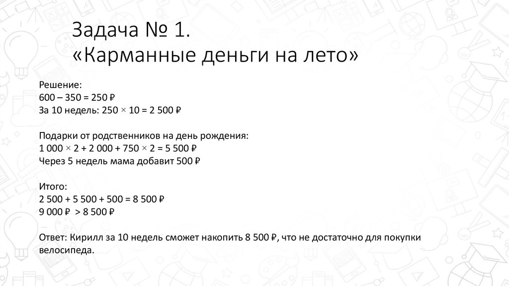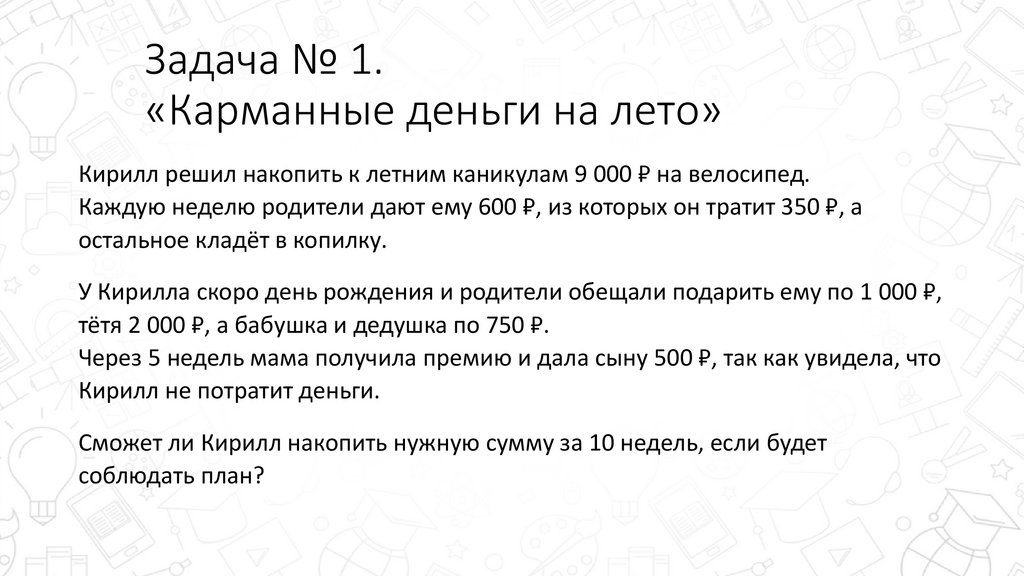 Каждую неделю родители дают ему 600 ₽, из которых он тратит 350 ₽, а