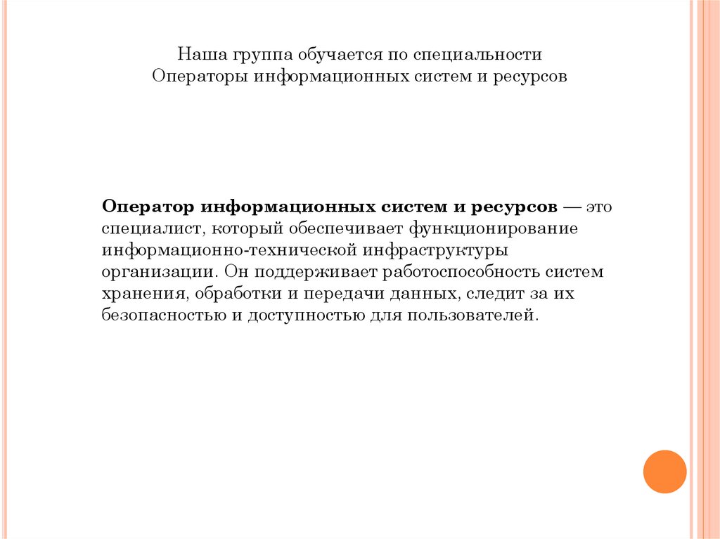 Наша группа обучается по специальностиОператоры информационных систем и ресурсов