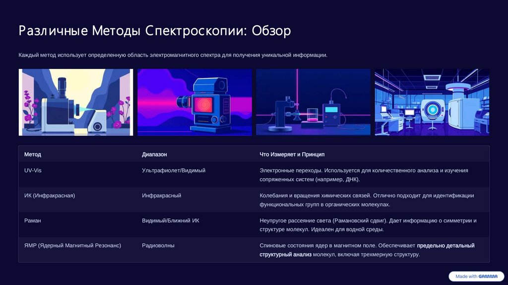 Разл ичные Методы Спектроскопии: ОбзорКаждый метод использует определенную область электромагнитного спектра для получения уникальной информации.