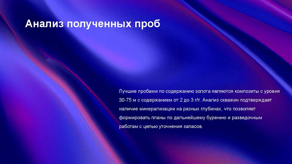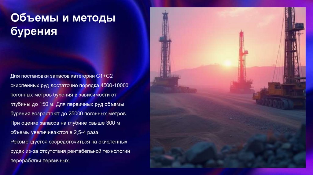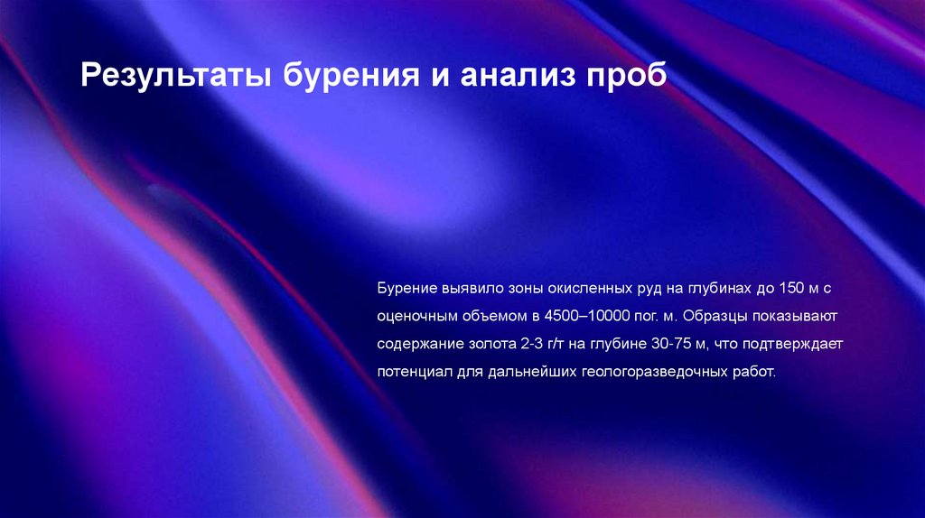 Результаты бурения и анализ пробБурение выявило зоны окисленных руд на глубинах до 150 м с