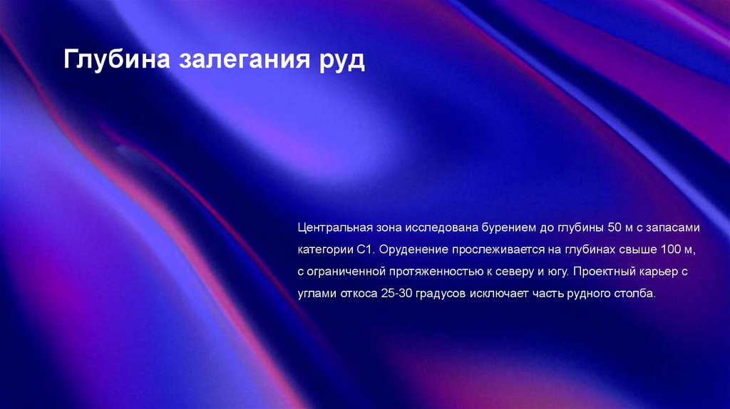 Глубина залегания рудЦентральная зона исследована бурением до глубины 50 м с запасами