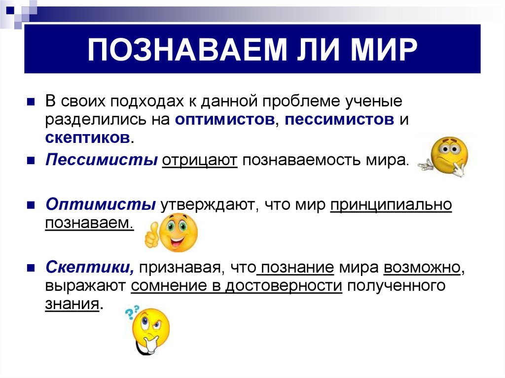 ПЕССИМИСТЫ - отрицают познаваемость мира.