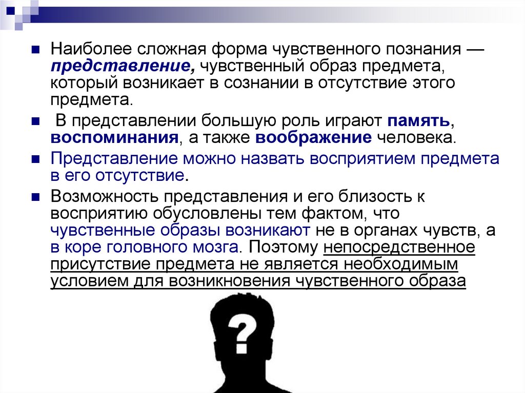 Наиболее сложная форма чувственного познания —представление, чувственный образ предмета,