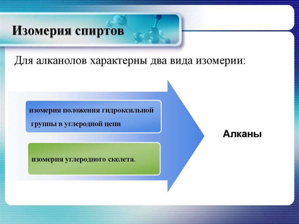 Для алканолов характерны два вида изомерии:изомерия положения гидроксильной