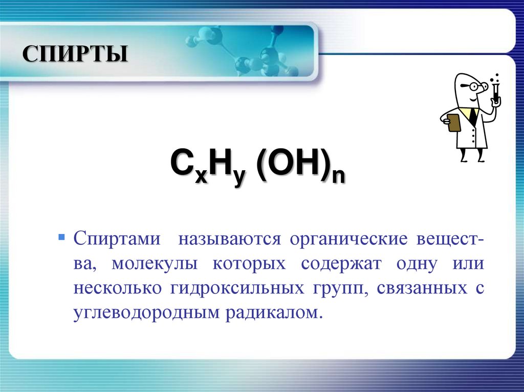 CxHy (OH)nСпиртами называются органические вещества, молекулы которых содержат одну или