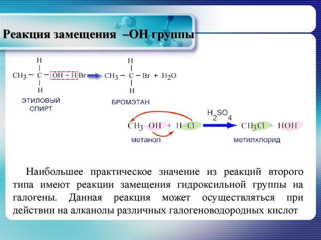 Наибольшее практическое значение из реакций второготипа имеют реакции замещения гидроксильной группы на