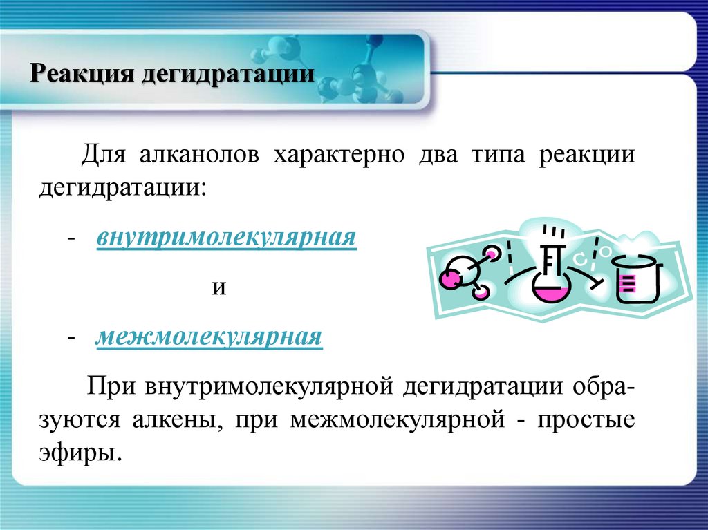 При внутримолекулярной дегидратации образуются алкены, при межмолекулярной - простые