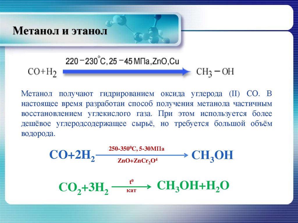Метанол получают гидрированием оксида углерода (II) СО. Внастоящее время разработан способ получения метанола частичным