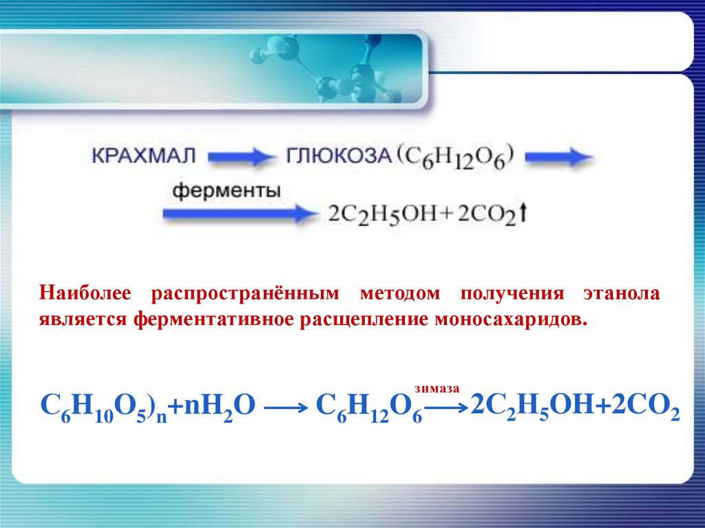 Наиболее распространённым методом получения этанолаявляется ферментативное расщепление моносахаридов.