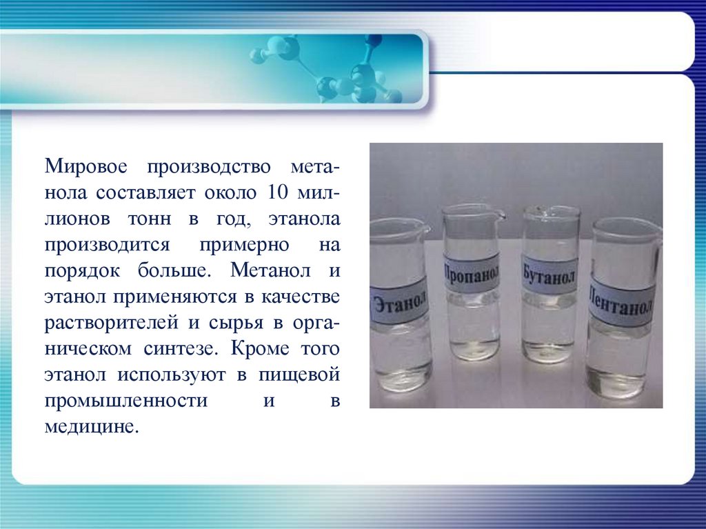 Мировое производство метанола составляет около 10 миллионов тонн в год, этанолапроизводится примерно на