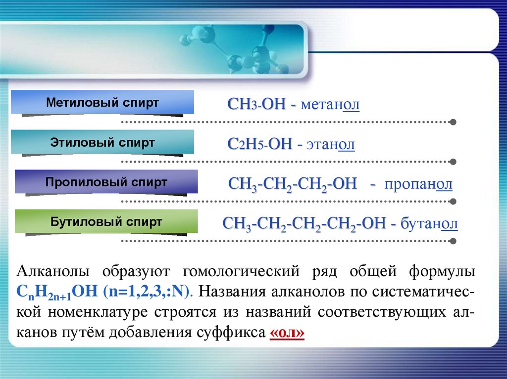 CnH2n+1OH (n=1,2,3,:N). Названия алканолов по систематической номенклатуре строятся из названий соответствующих алканов путём добавления суффикса «ол»