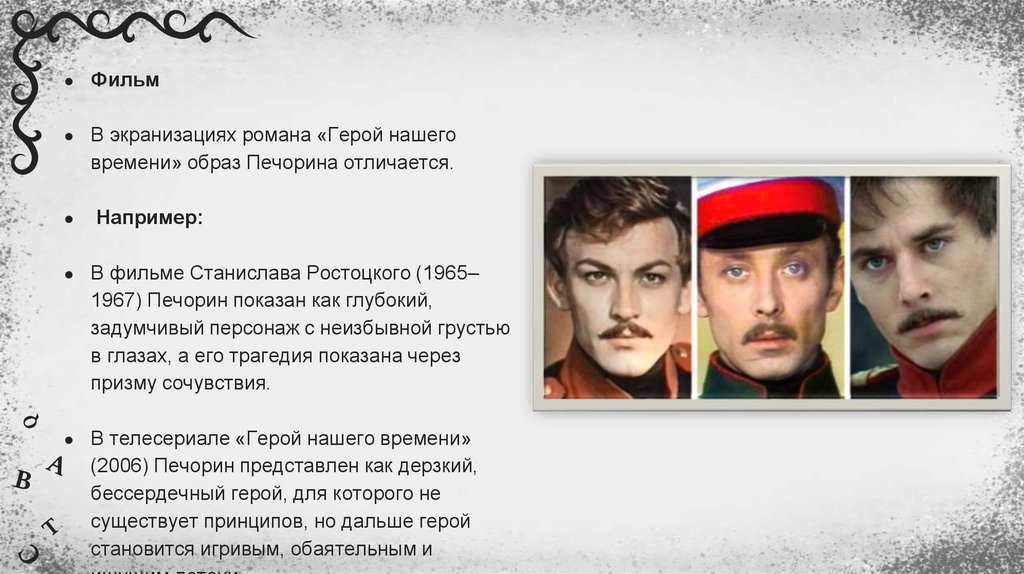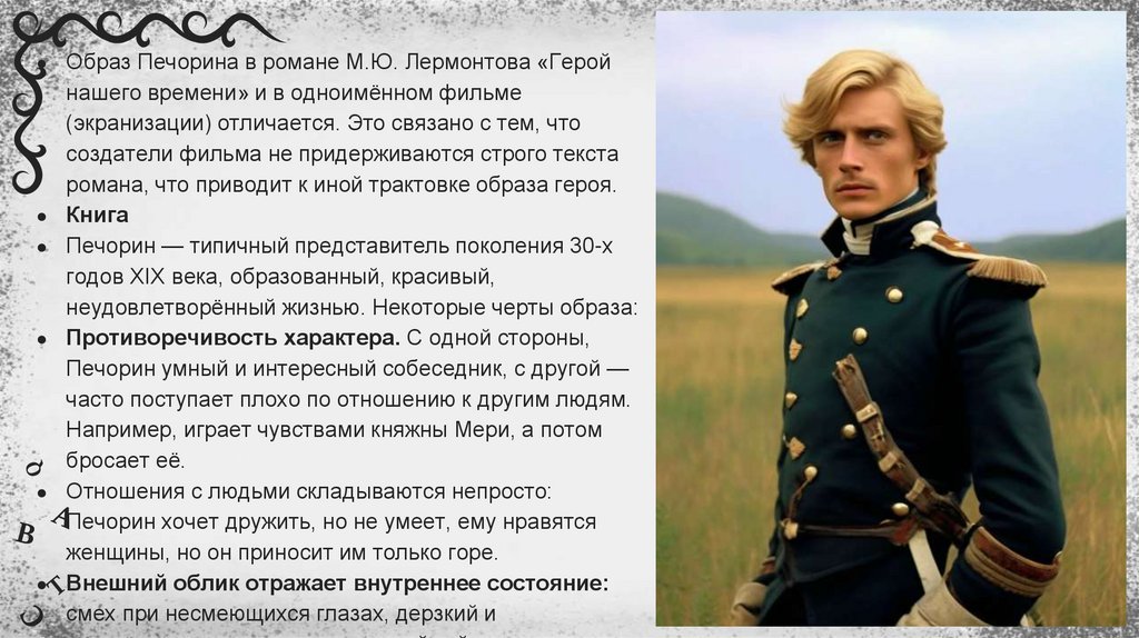 ● Образ Печорина в романе М.Ю. Лермонтова «Геройнашего времени» и в одноимённом фильме