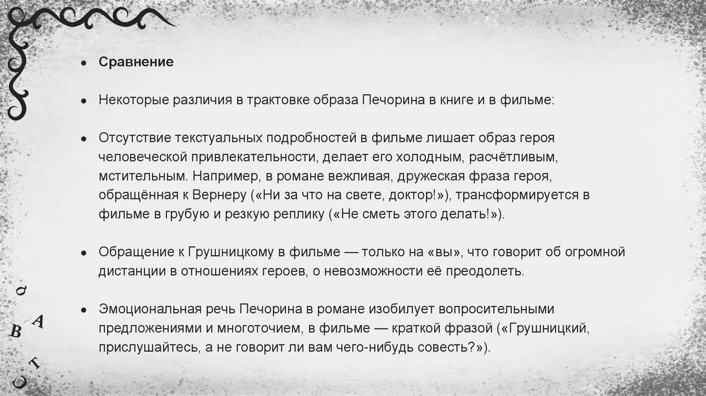 ● Сравнение● Некоторые различия в трактовке образа Печорина в книге и в фильме: