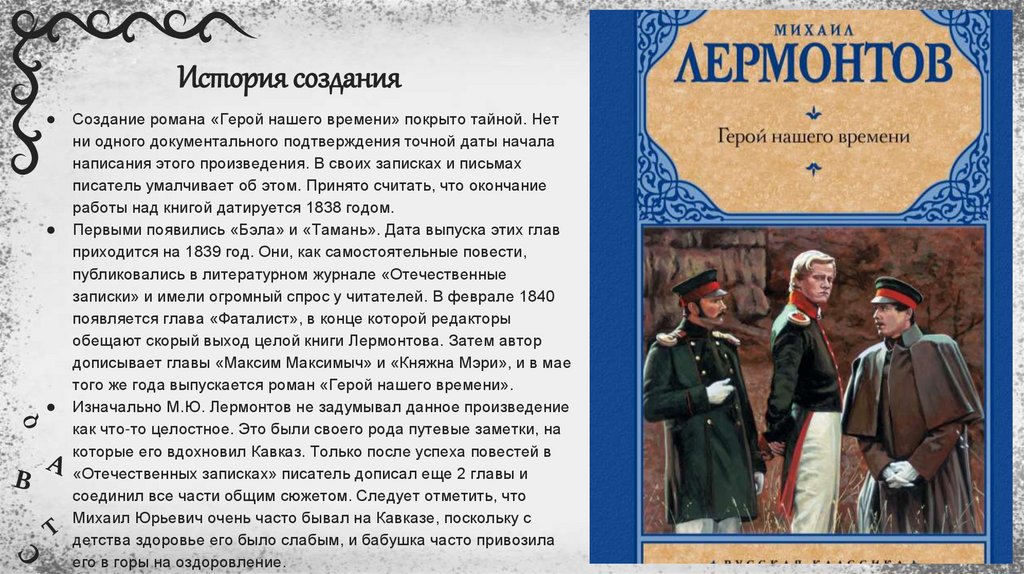 ● Создание романа «Герой нашего времени» покрыто тайной. Нетни одного документального подтверждения точной даты начала