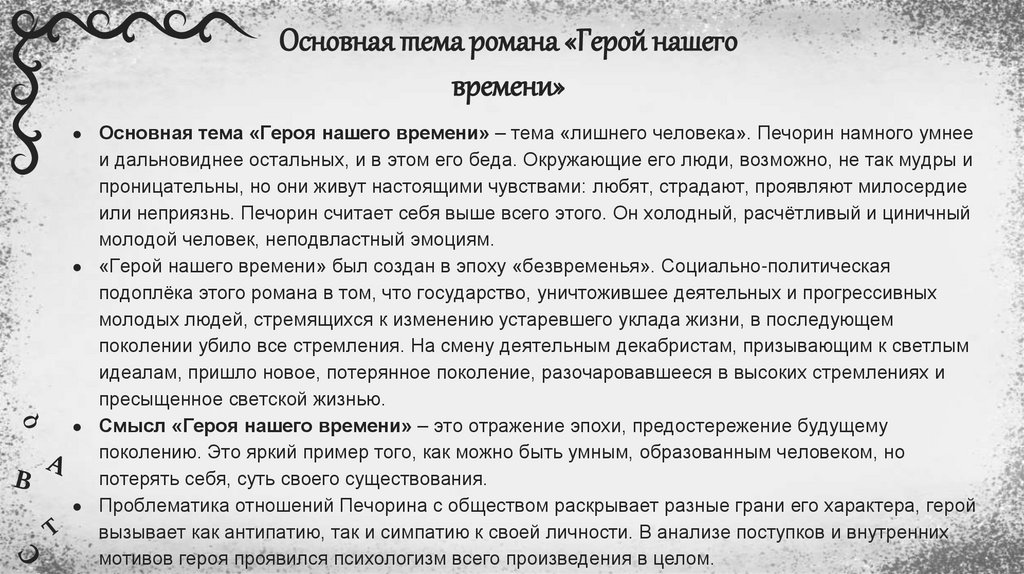 ● Основная тема «Героя нашего времени» – тема «лишнего человека». Печорин намного умнееи дальновиднее остальных, и в этом его беда. Окружающие его люди, возможно, не так мудры и