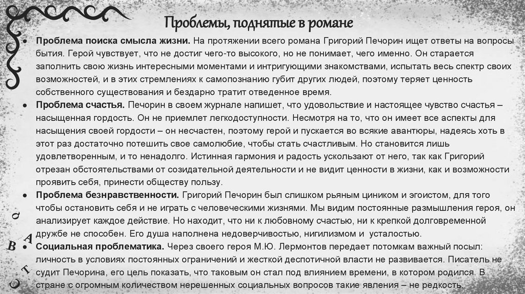 ● Проблема поиска смысла жизни. На протяжении всего романа Григорий Печорин ищет ответы на вопросыбытия. Герой чувствует, что не достиг чего-то высокого, но не понимает, чего именно. Он старается