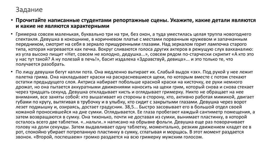 • Прочитайте написанные студентами репортажные сцены. Укажите, какие детали являютсяи какие не являются характерными