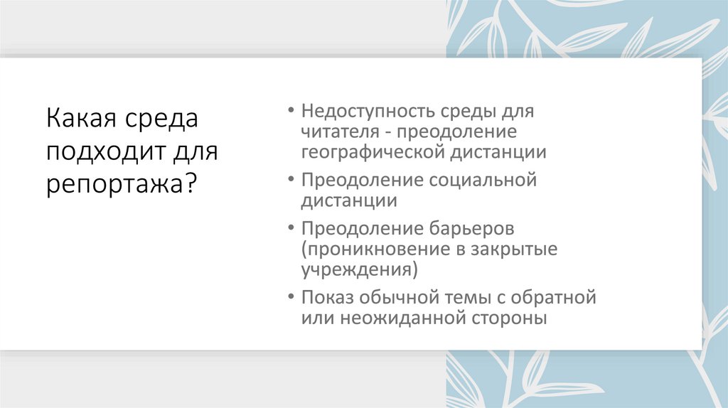 16. Какая среда подходит для репортажа?