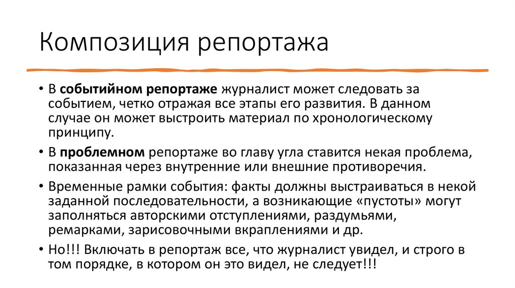 • Но!!! Включать в репортаж все, что журналист увидел, и строго в