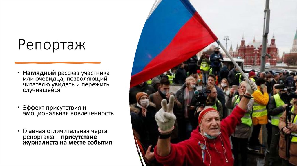 позиция «очевидца» в) наличие героя репортажа г) передача прямой