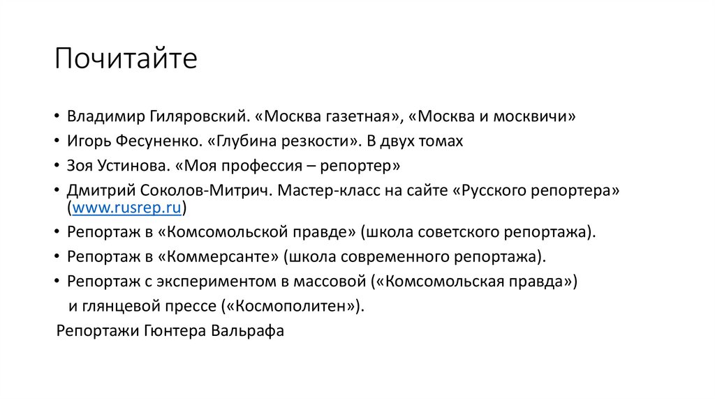 • Репортаж в «Комсомольской правде» (школа советского репортажа).