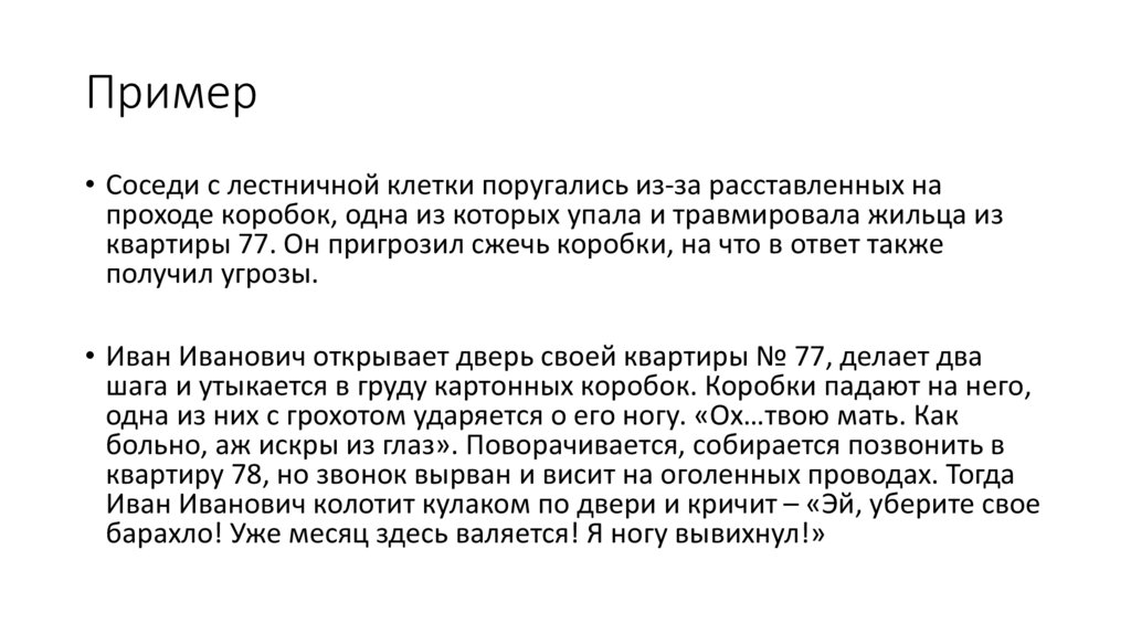 • Соседи с лестничной клетки поругались из-за расставленных напроходе коробок, одна из которых упала и травмировала жильца из