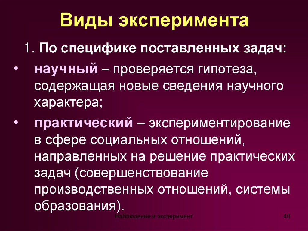 1. По специфике поставленных задач:научный – проверяется гипотеза,