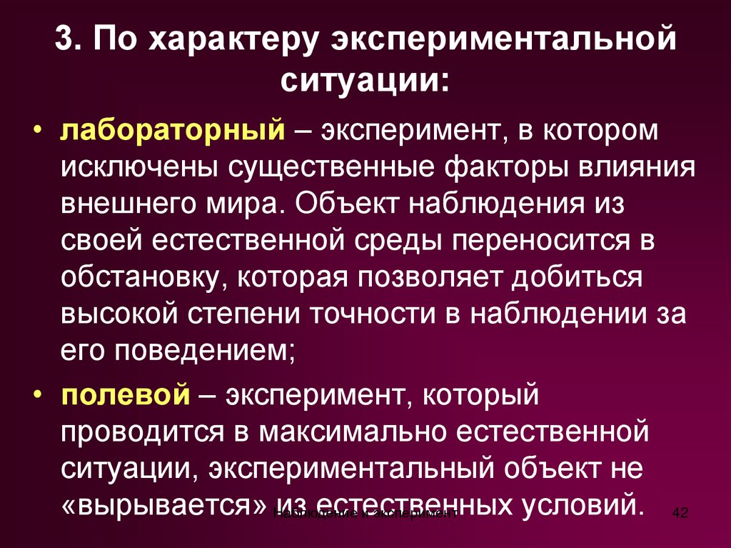 • лабораторный – эксперимент, в которомисключены существенные факторы влияния
